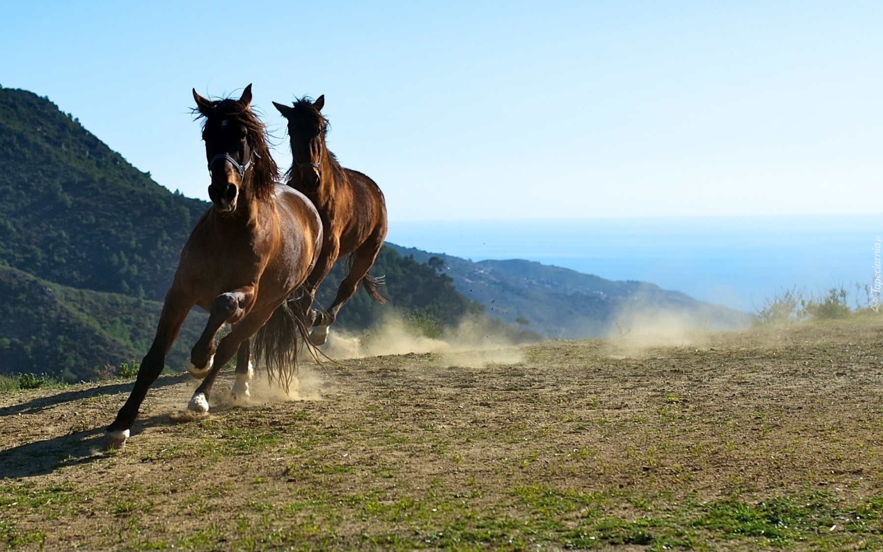Edytor tapety: Dwa, Konie, Trawa, Niebo