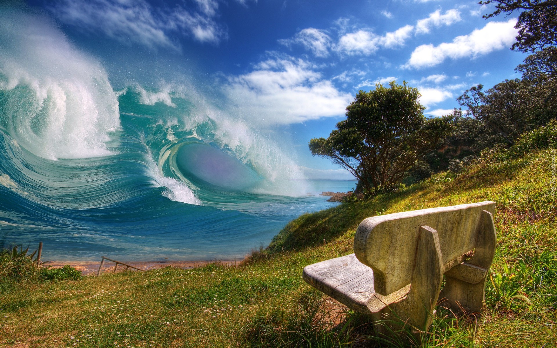 Edytor tapety: Morze, Łąka, Ławka, Fale