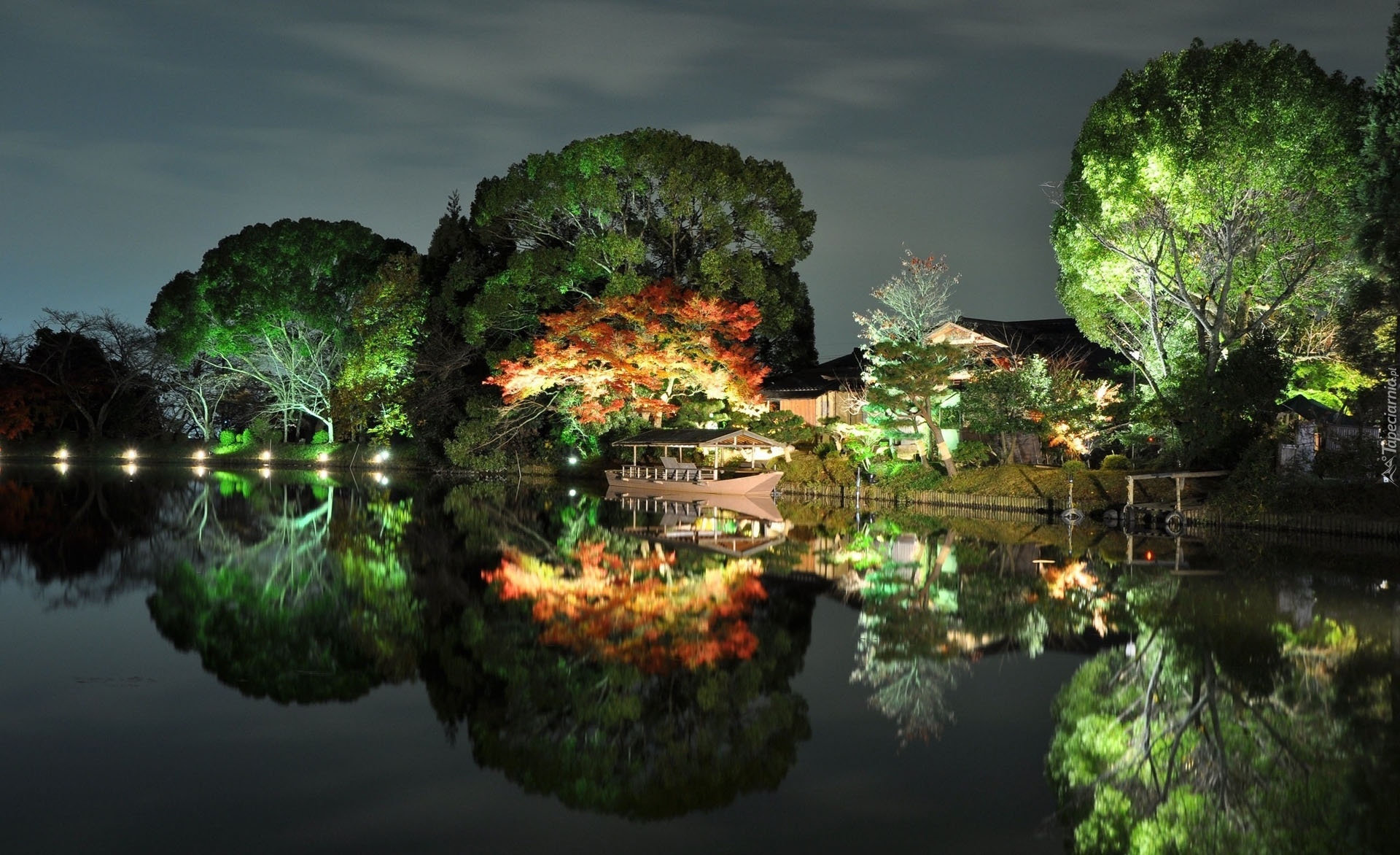 Edytor tapety: Jezioro, Łódź, Drzewa, Oświetlenie
