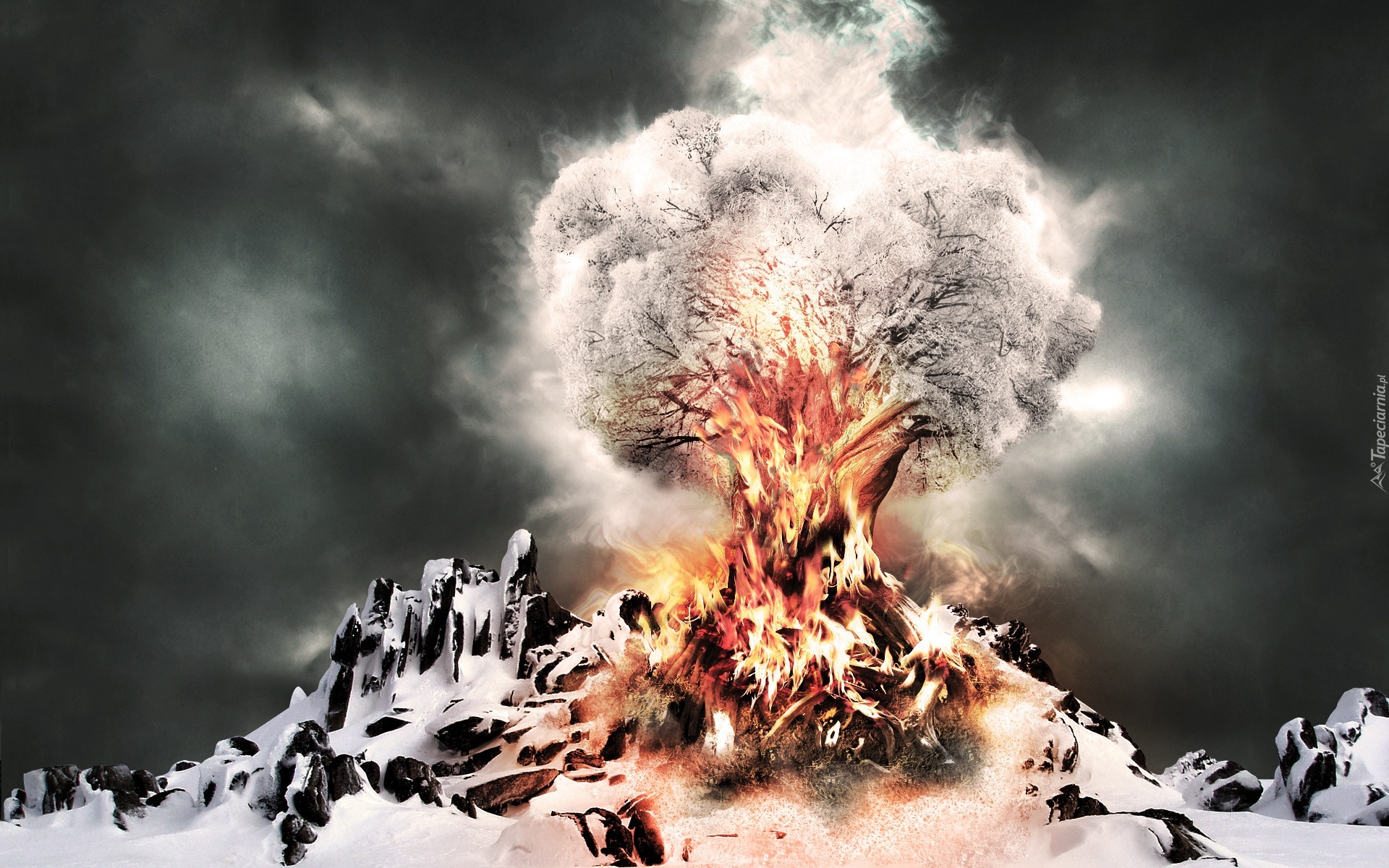 Edytor tapety: Ogniste, Drzewo, Skały, Śnieg
