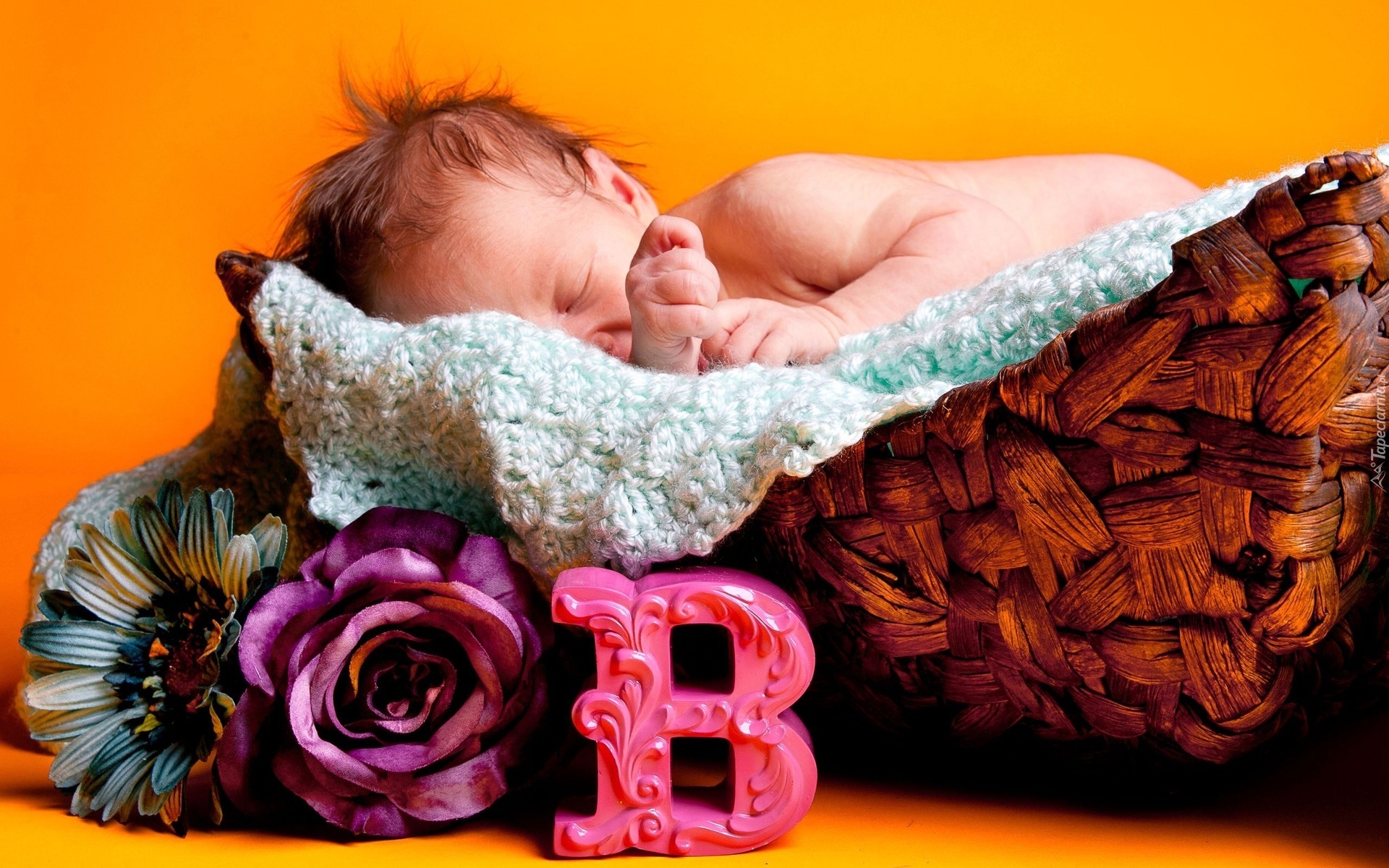 Edytor tapety: Niemowlak, Kosz, Kocyk, Kwiaty