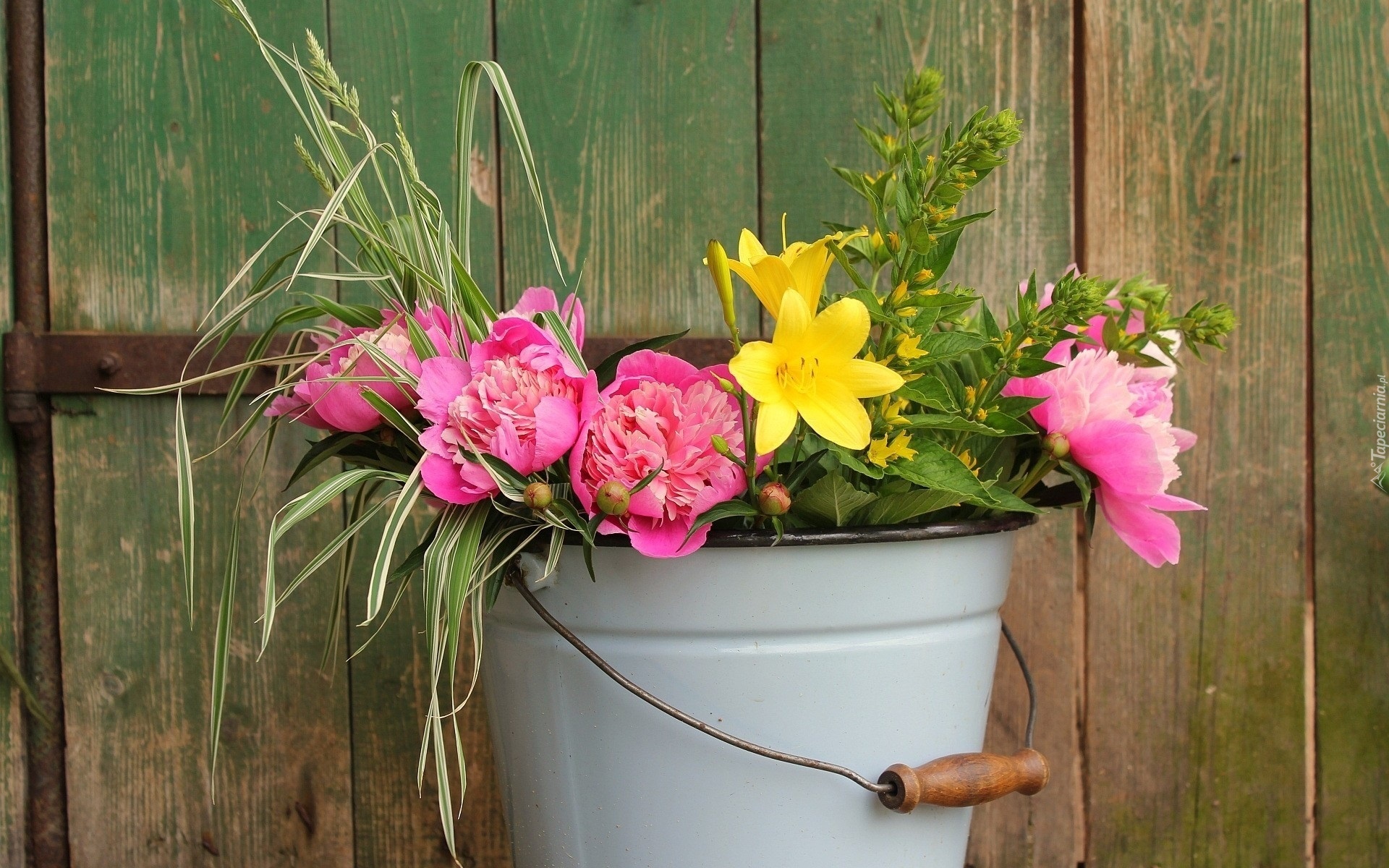 Edytor tapety: Wiadro, Różowe, Piwonie, Żółte, Kwiaty