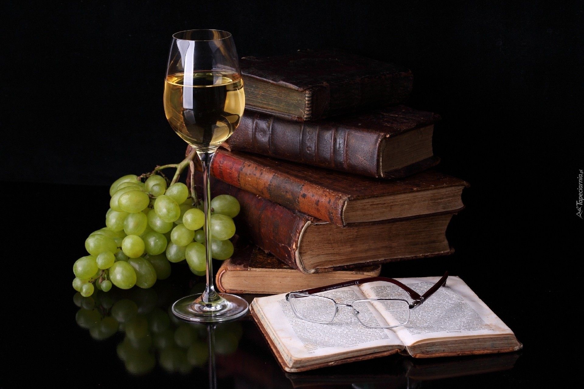 Edytor tapety: Winogrona, Książki, Lampka, Wina, Okulary