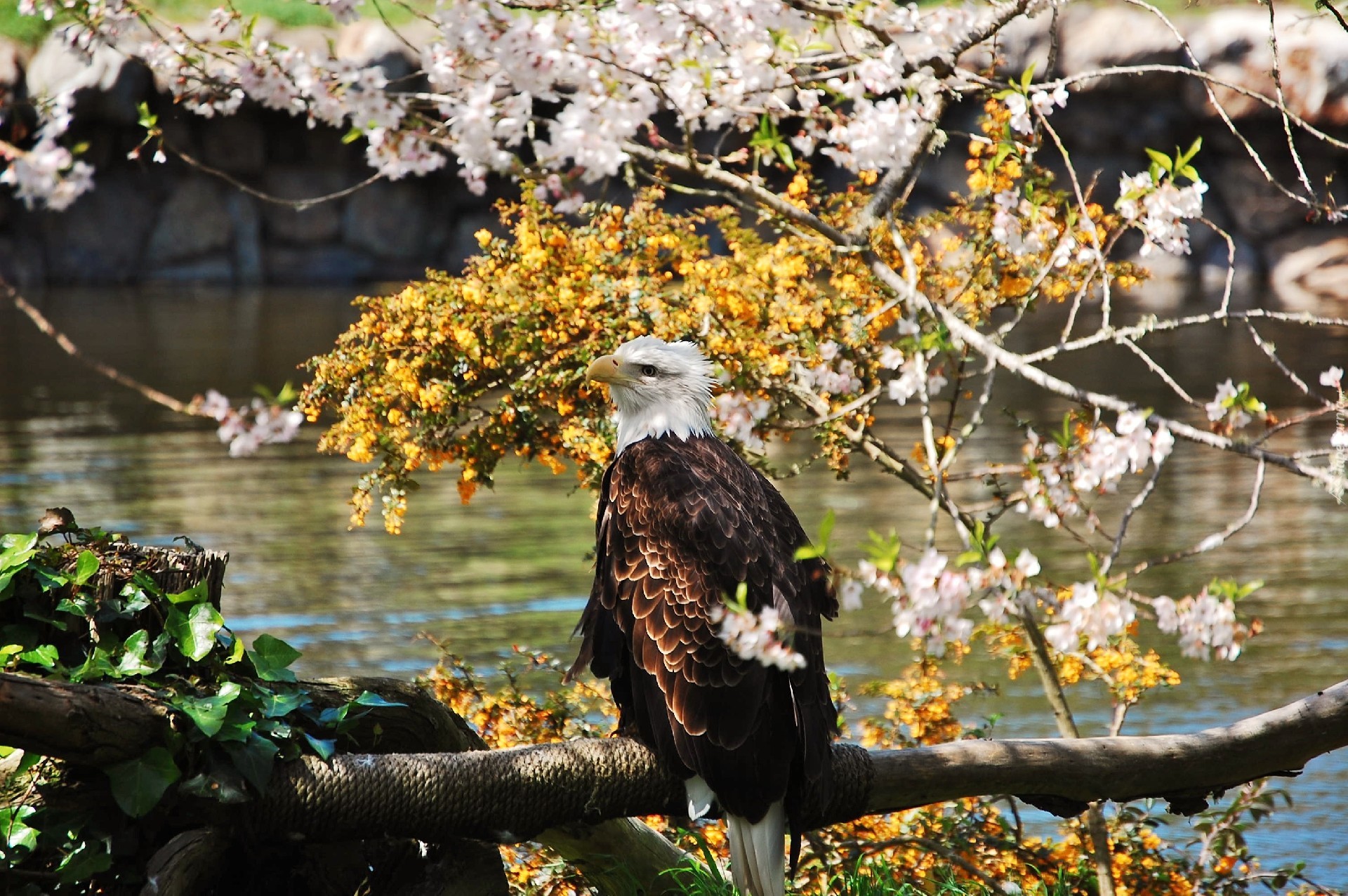 Edytor tapety: Bielik amerykański, Gałąź, Kwiatki, Woda