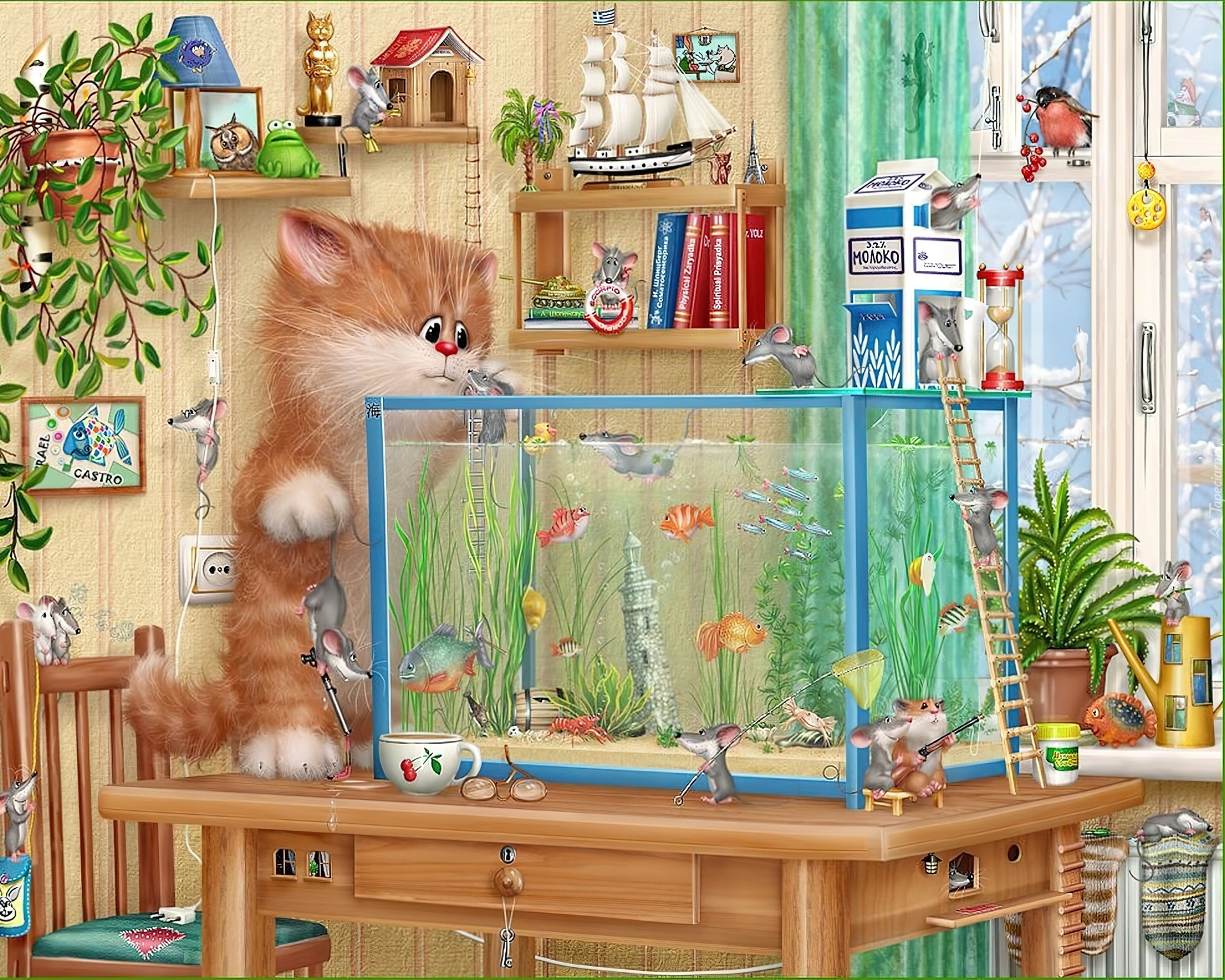 Edytor tapety: Akwarium, Kot, Rybki, Pokój dziecięcy, Myszy, Półki, Książki