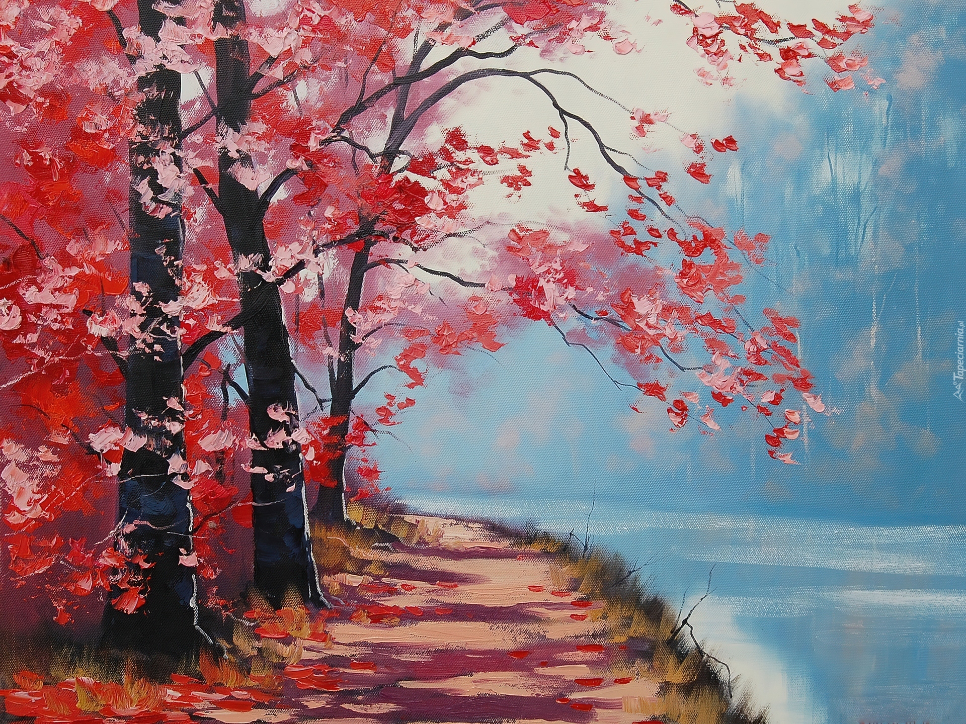 Edytor tapety: Rzeka, Ścieżka, Las, Czerwone, Liście