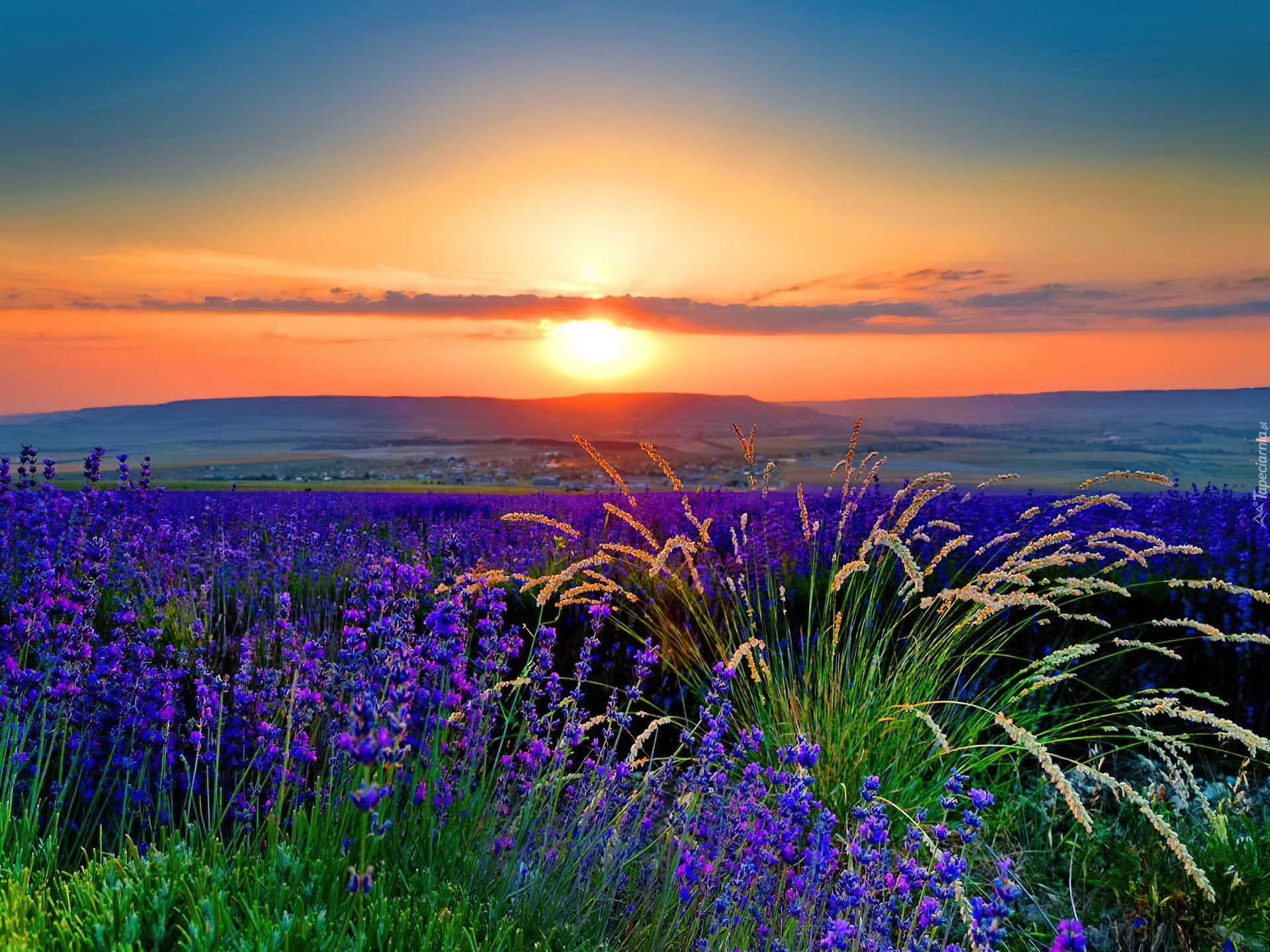 Edytor tapety: Zachód, Słońca, Kwiatki, Trawa