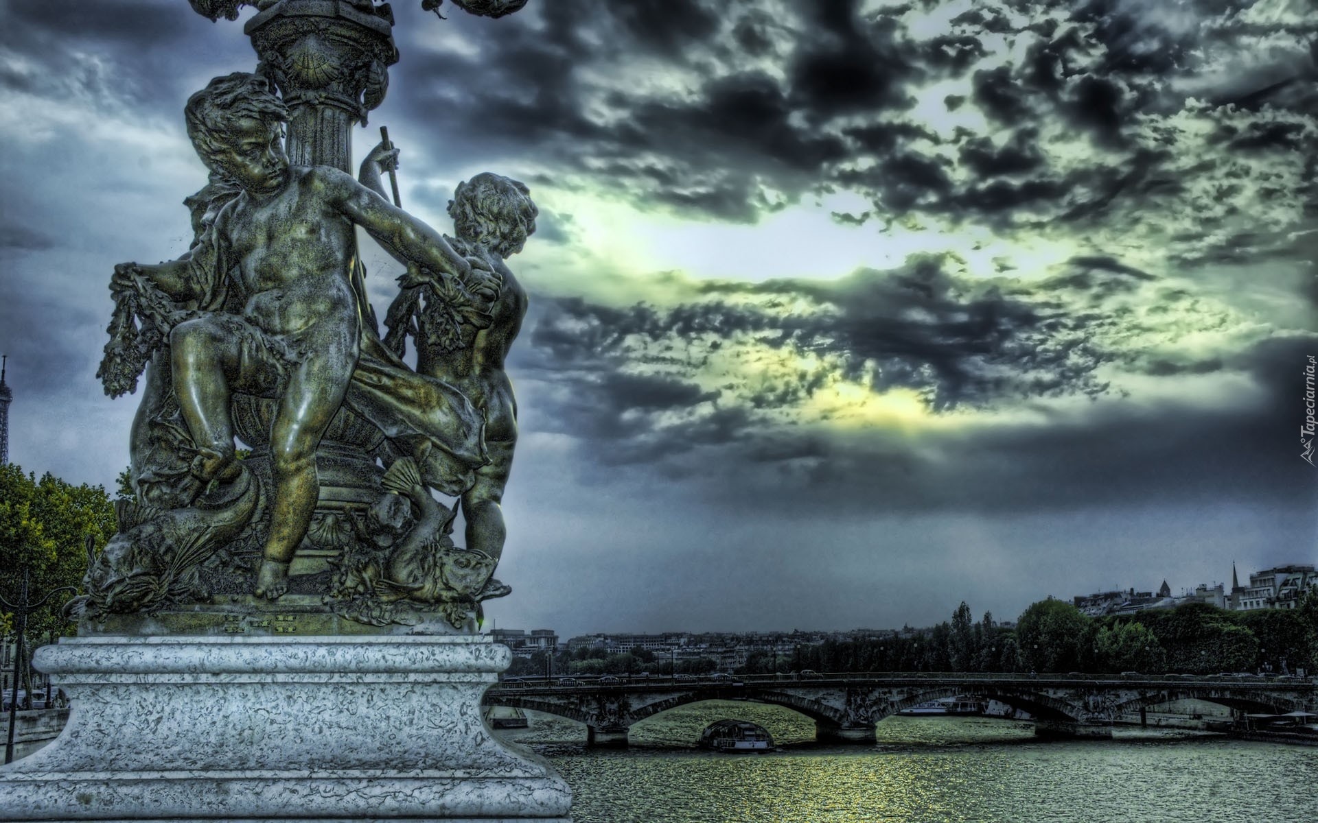 Edytor tapety: Posąg, Rzeka, Most, Niebo