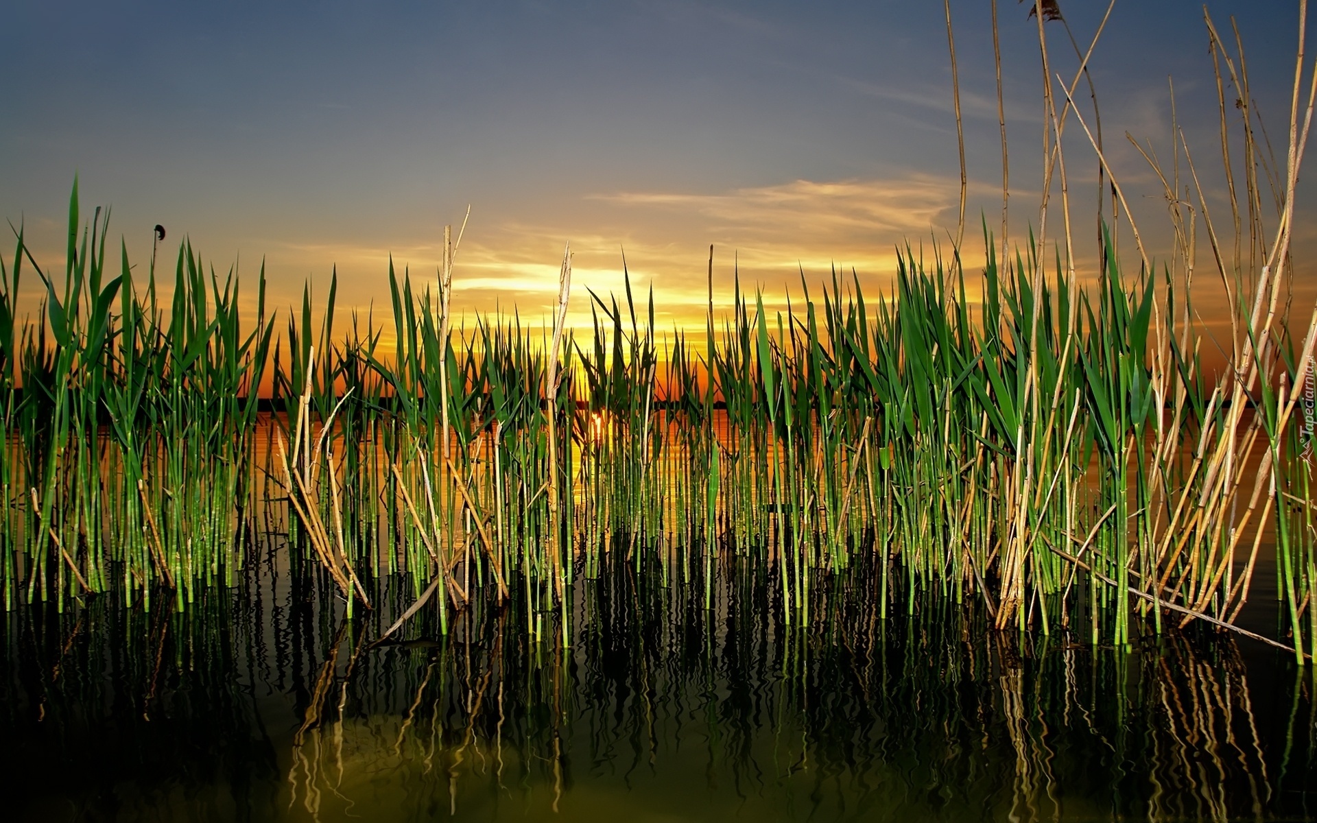 Edytor tapety: Trawy, Jezioro, Zachód