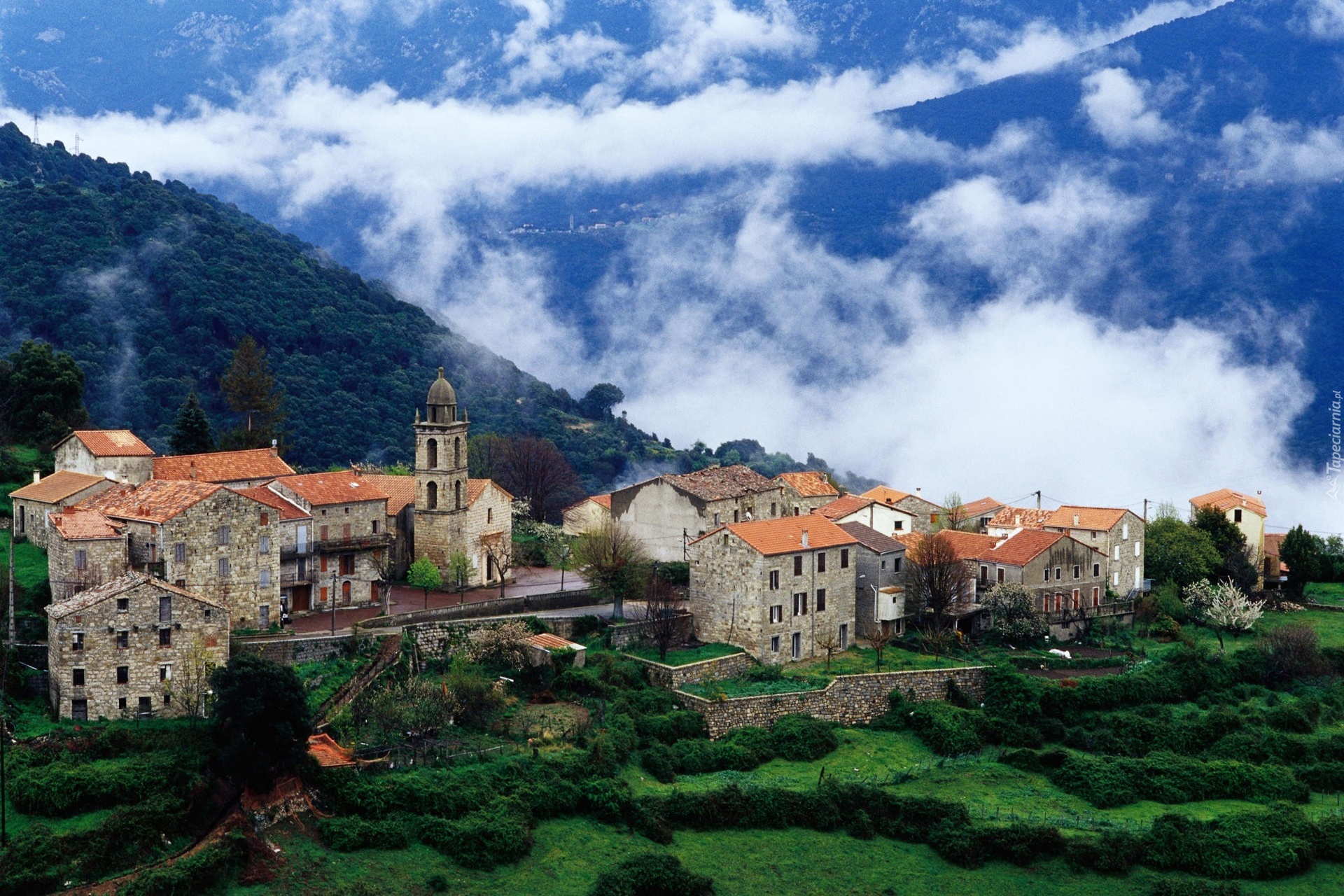 Edytor tapety: Góry, Chmury, Wioska, Budynki