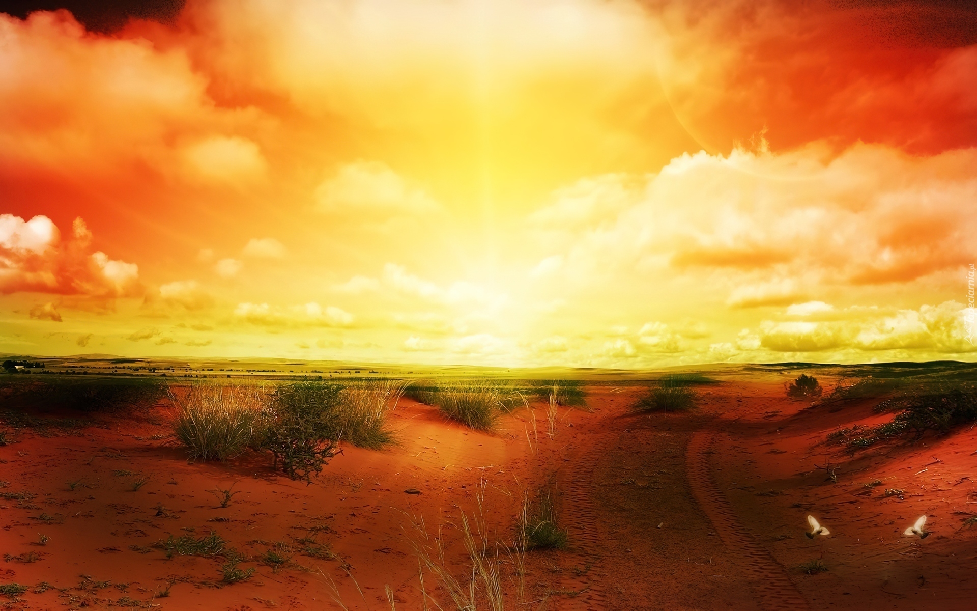Edytor tapety: Zachód, Słońca, Chmury, Pustynia, Rośliny