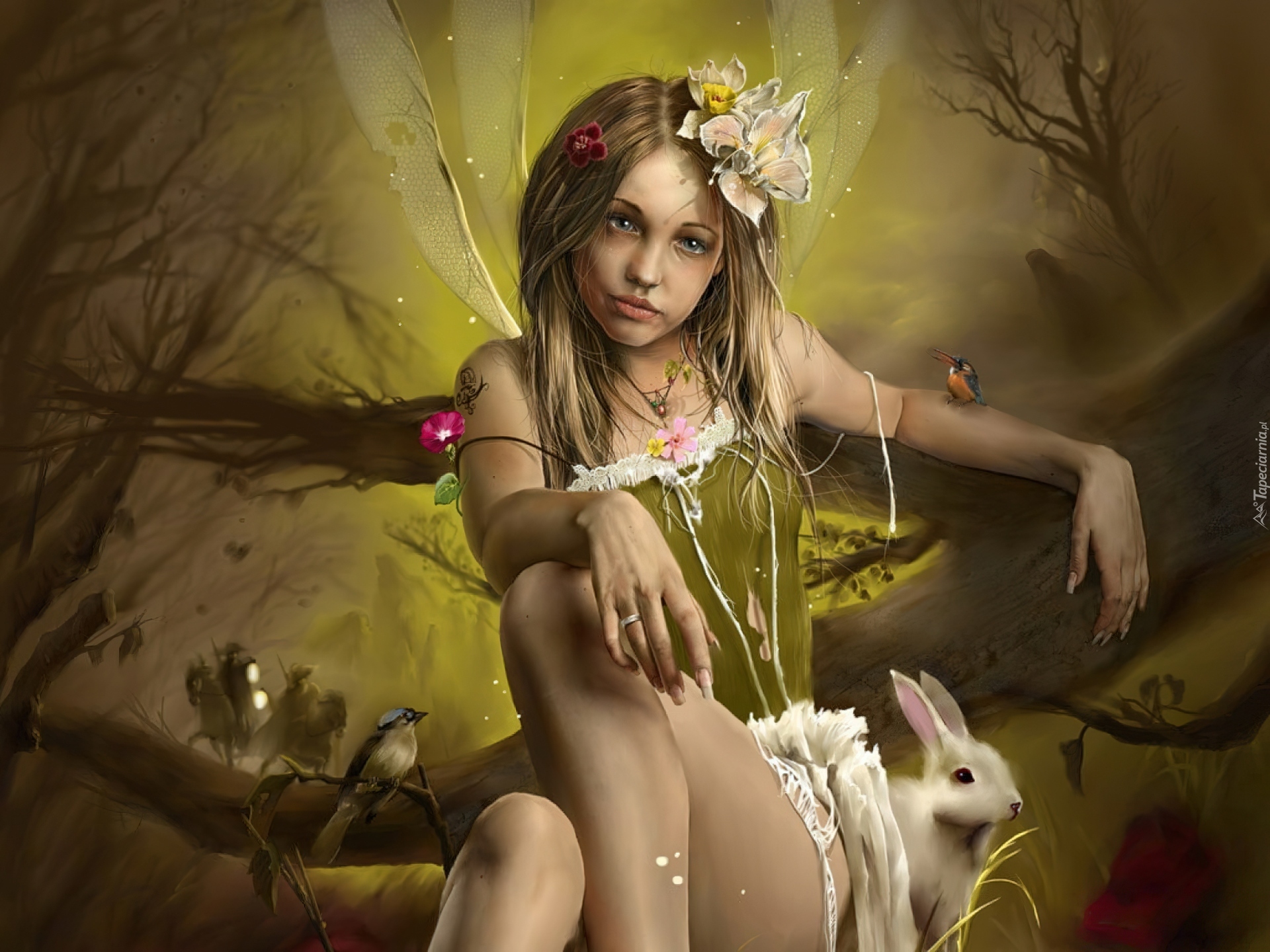 Edytor tapety: Dziewczyna, Motyl, Króliczek, Ptaki