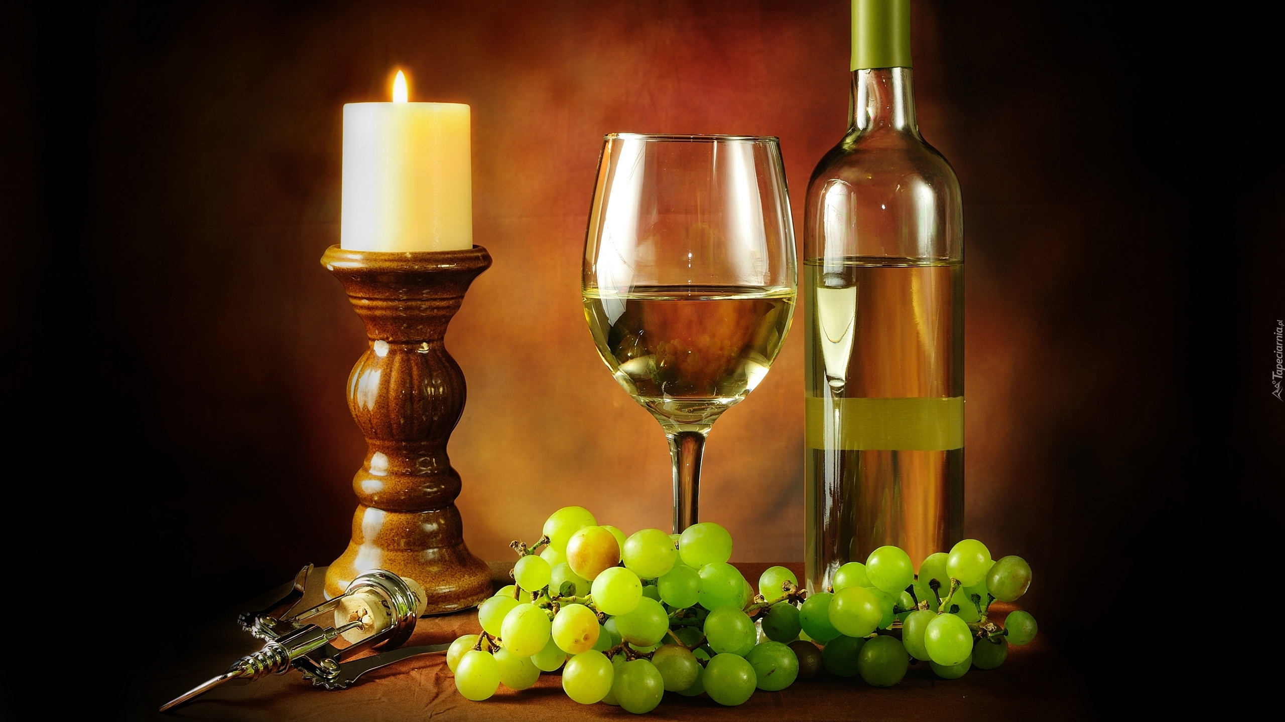 Edytor tapety: Kompozycja, Świeca, Winogrona, Wino, Kieliszek, Butelka
