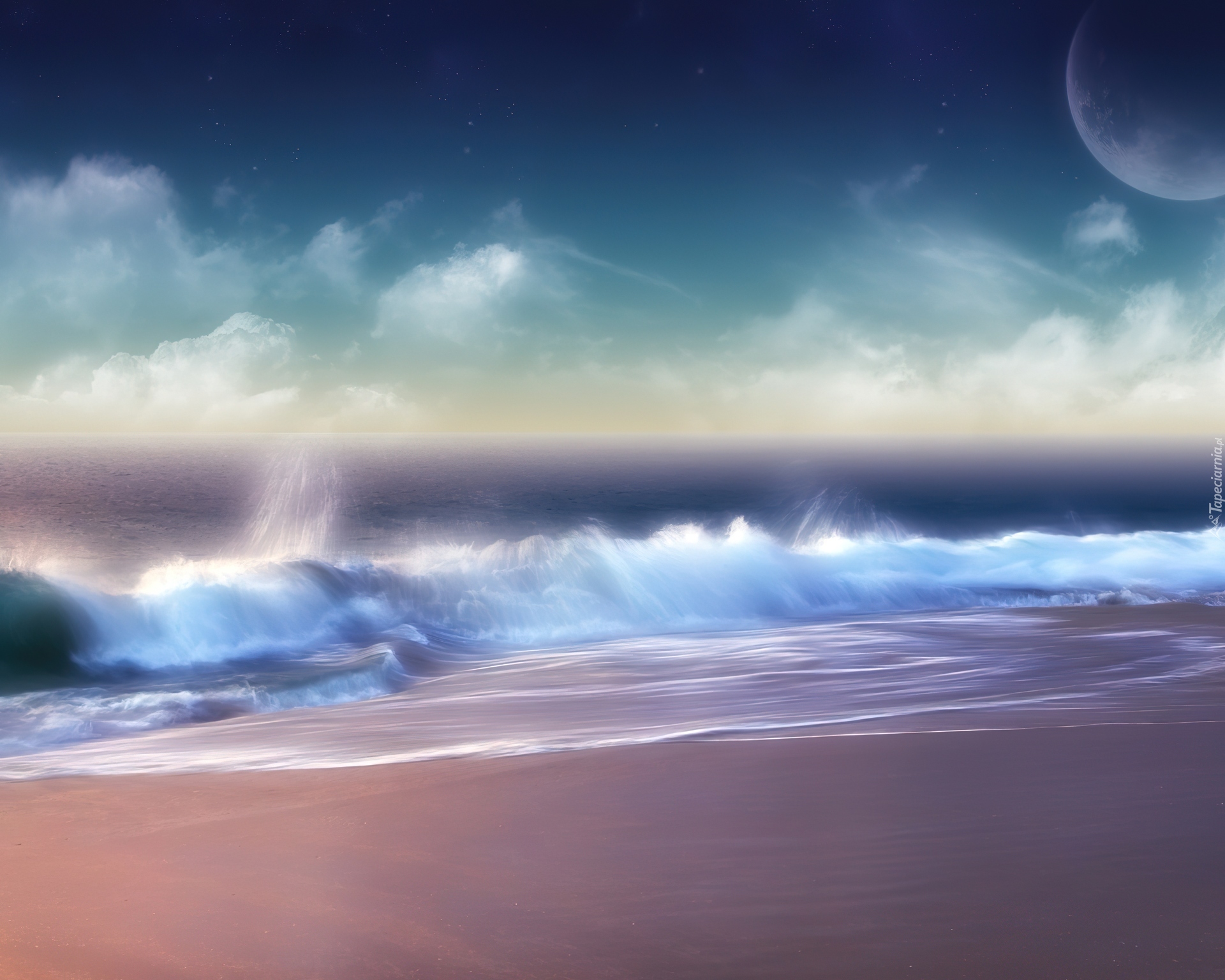 Edytor tapety: Morze, Fale, Plaża, Chmury, Księżyc