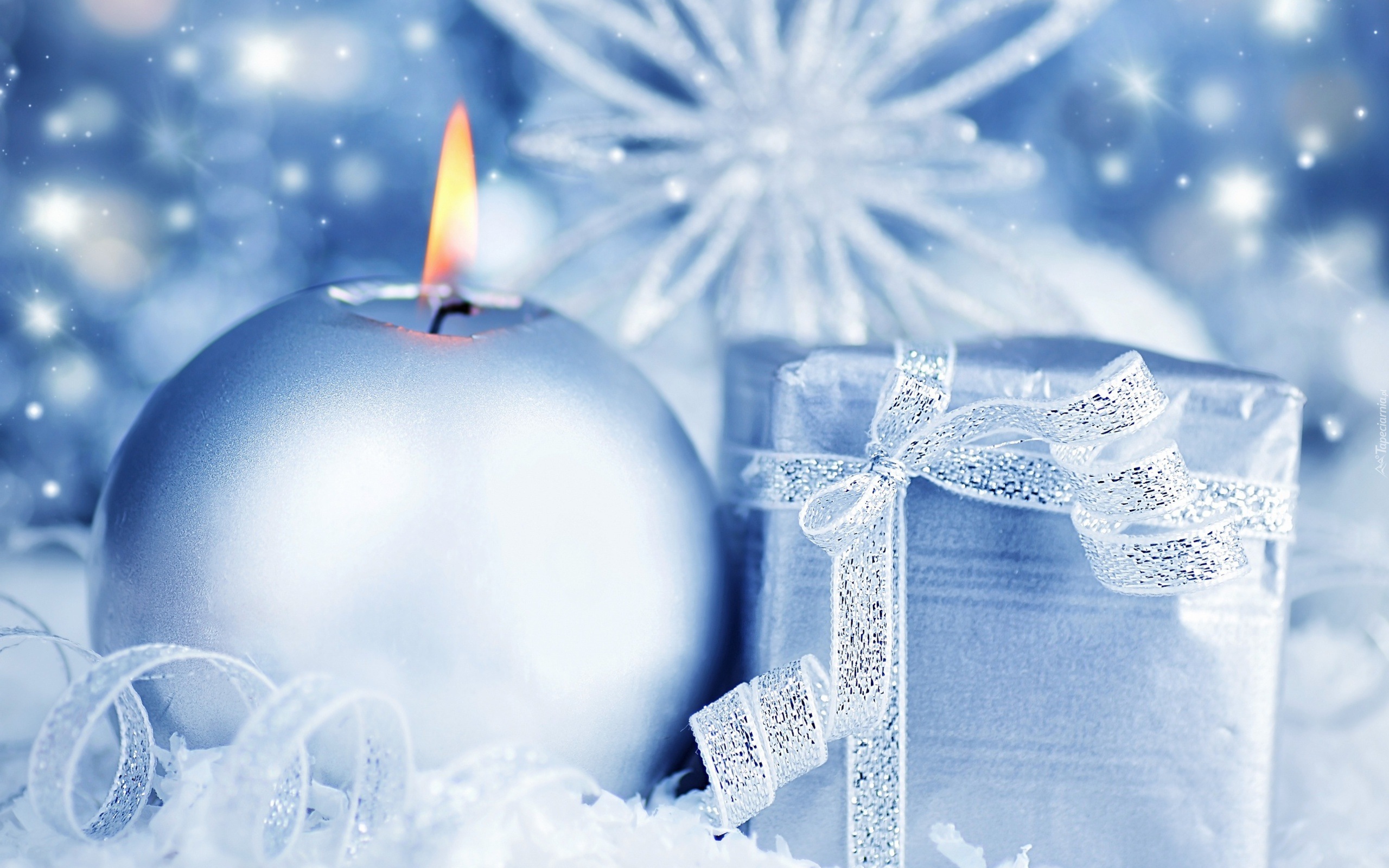 Edytor tapety: Prezent, Niebieska, Świeczka, Kula, Dekoracja