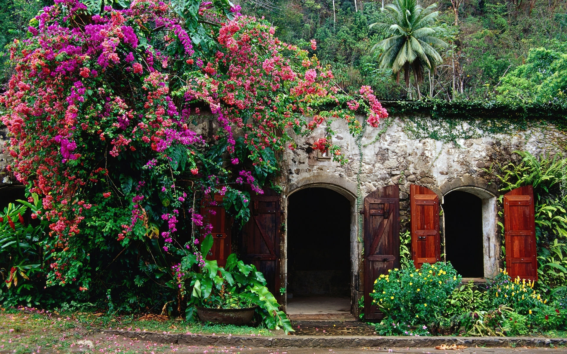 Edytor tapety: Budynek, Krzewy, Kwiatowe, Las, Droga