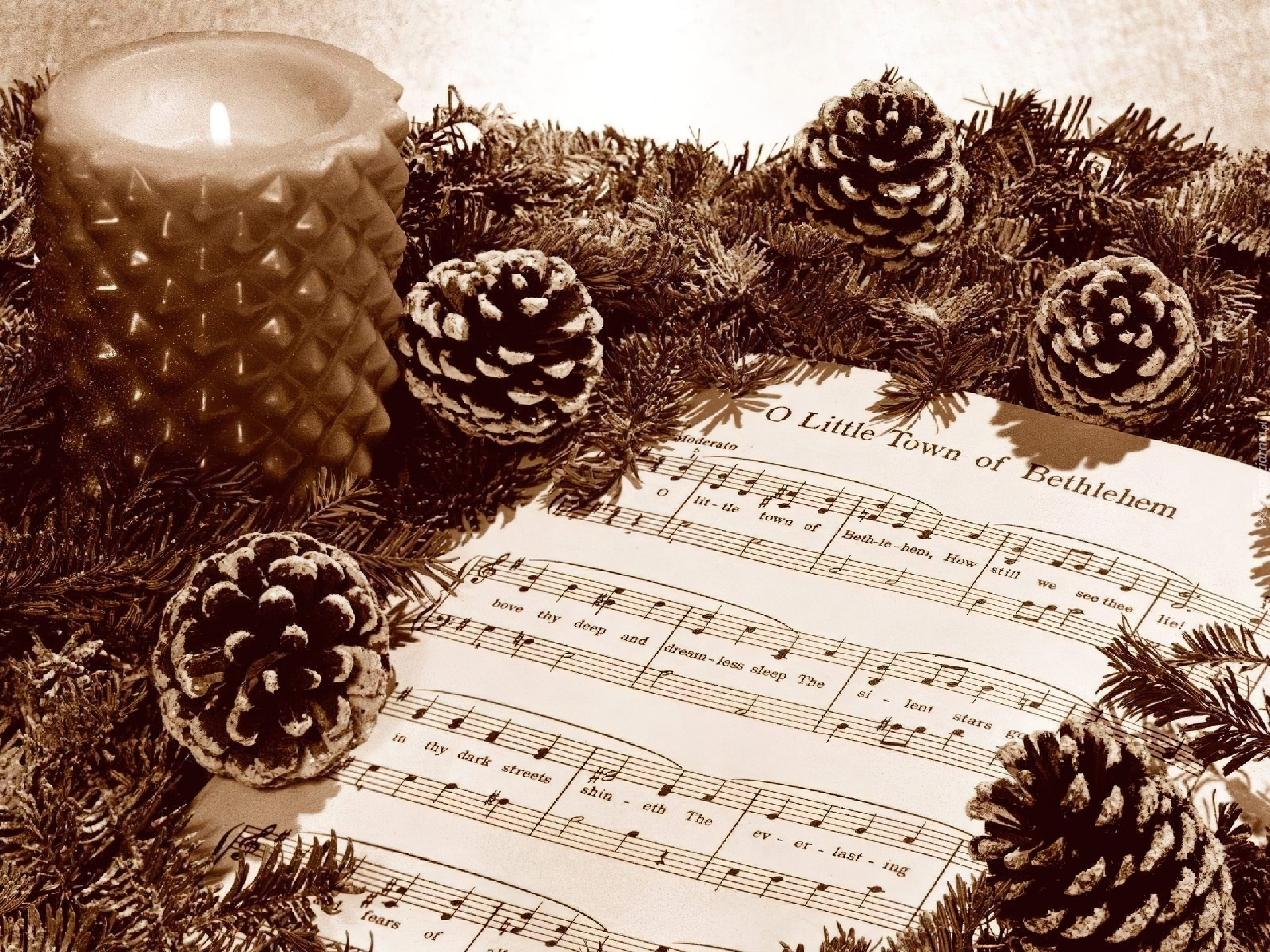 Edytor tapety: Kompozycja, Świąteczna, Szyszki, Świeca, Nuty, Sepia