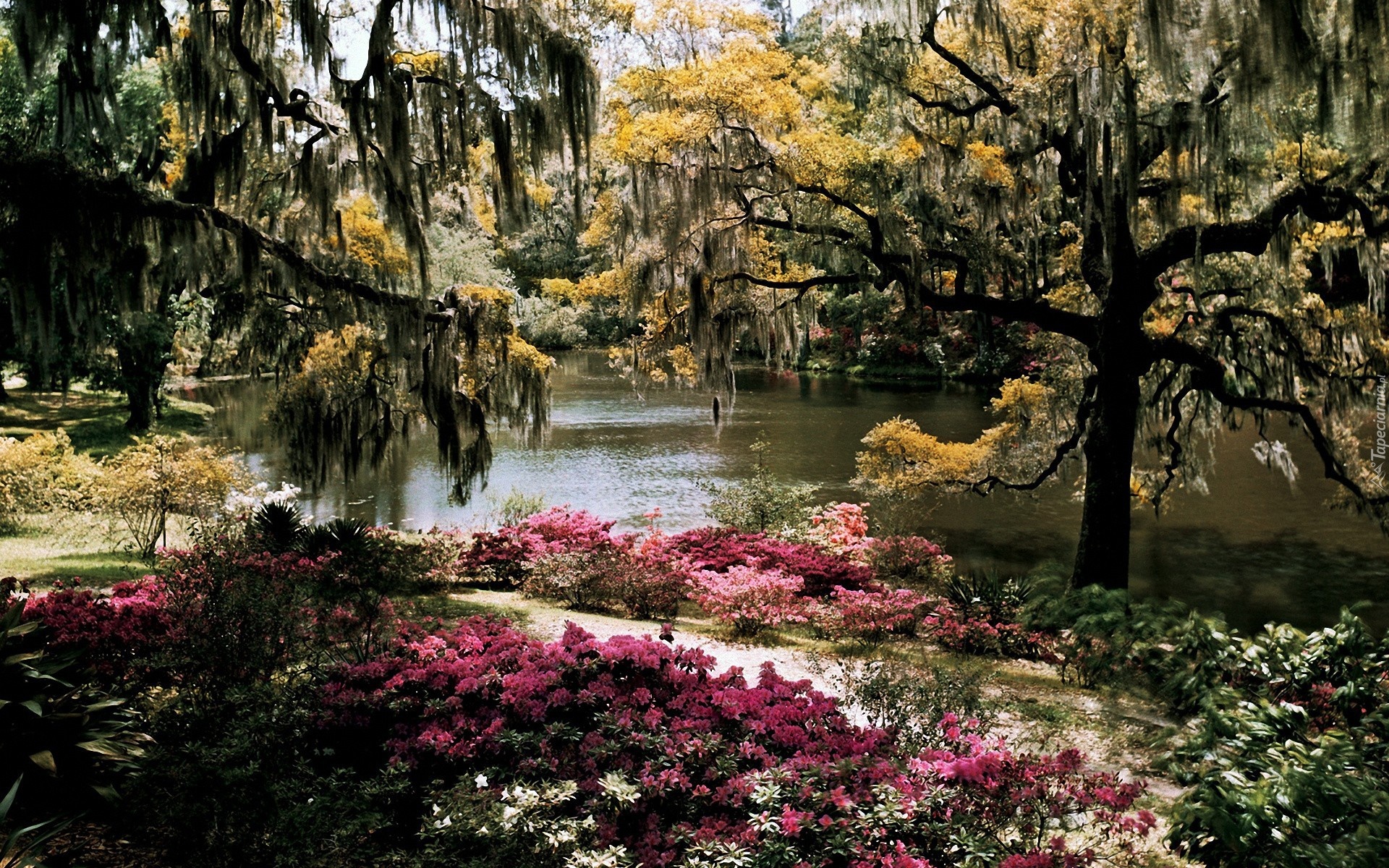 Edytor tapety: Park, Staw, Kwiaty, Drzewa