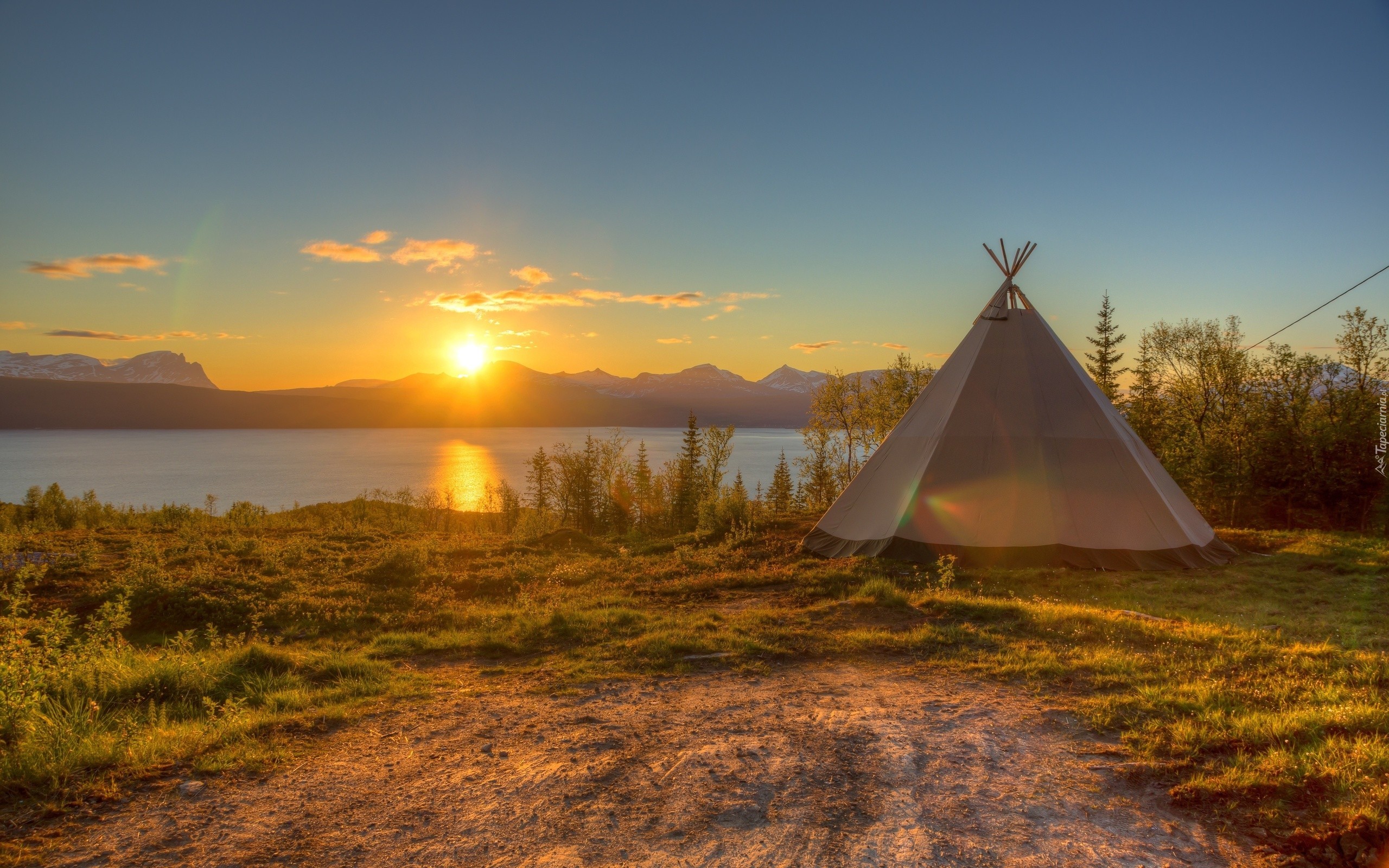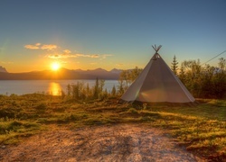 Edytor tapety: Jezioro, Niebo, Trawa, Namiot