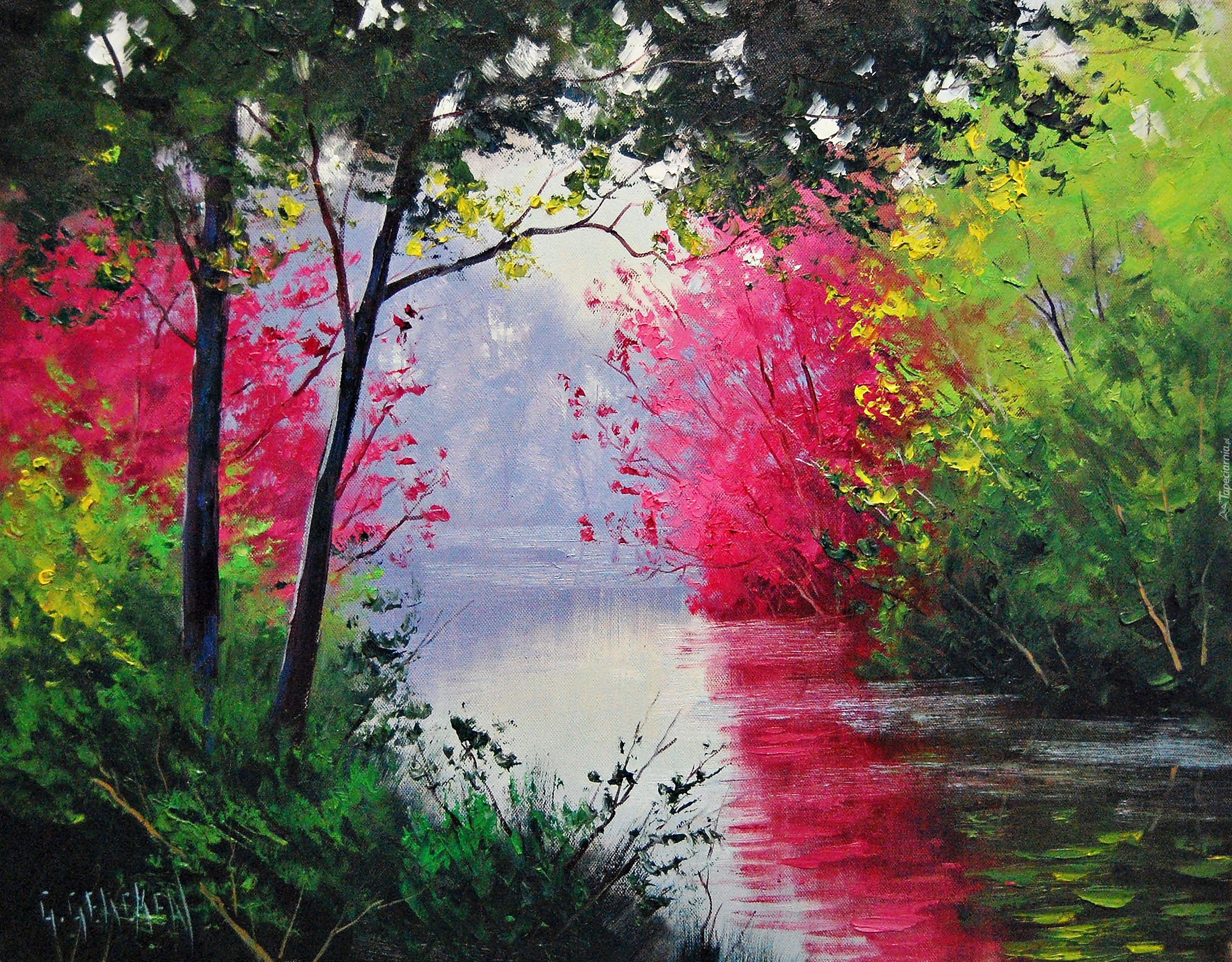 Edytor tapety: Jezioro, Drzewa, Czerwone, Liście