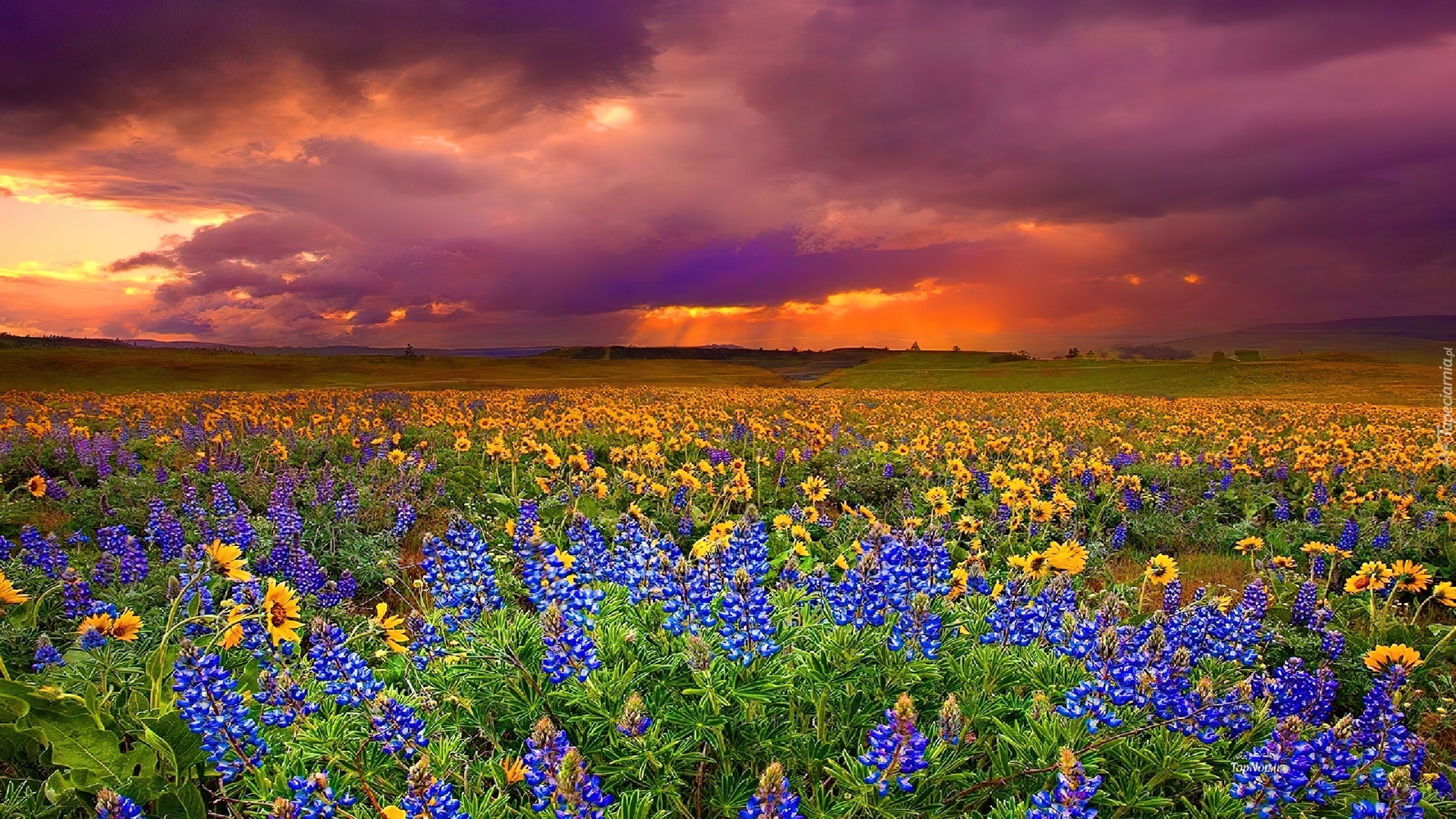 Edytor tapety: Zachód, Słońca, Łąka, Kwiaty