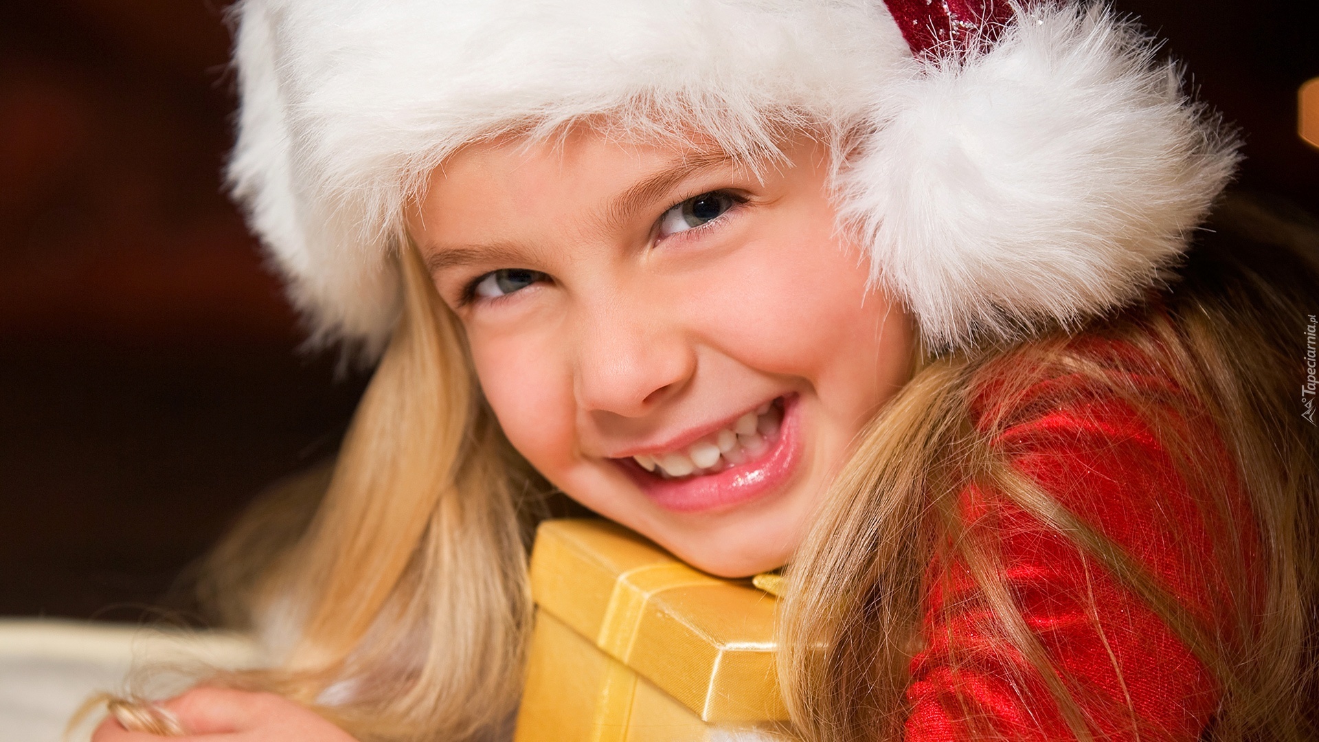 Edytor tapety: Uśmiech, Dziewczynka, Czerwona, Czapka, Prezent
