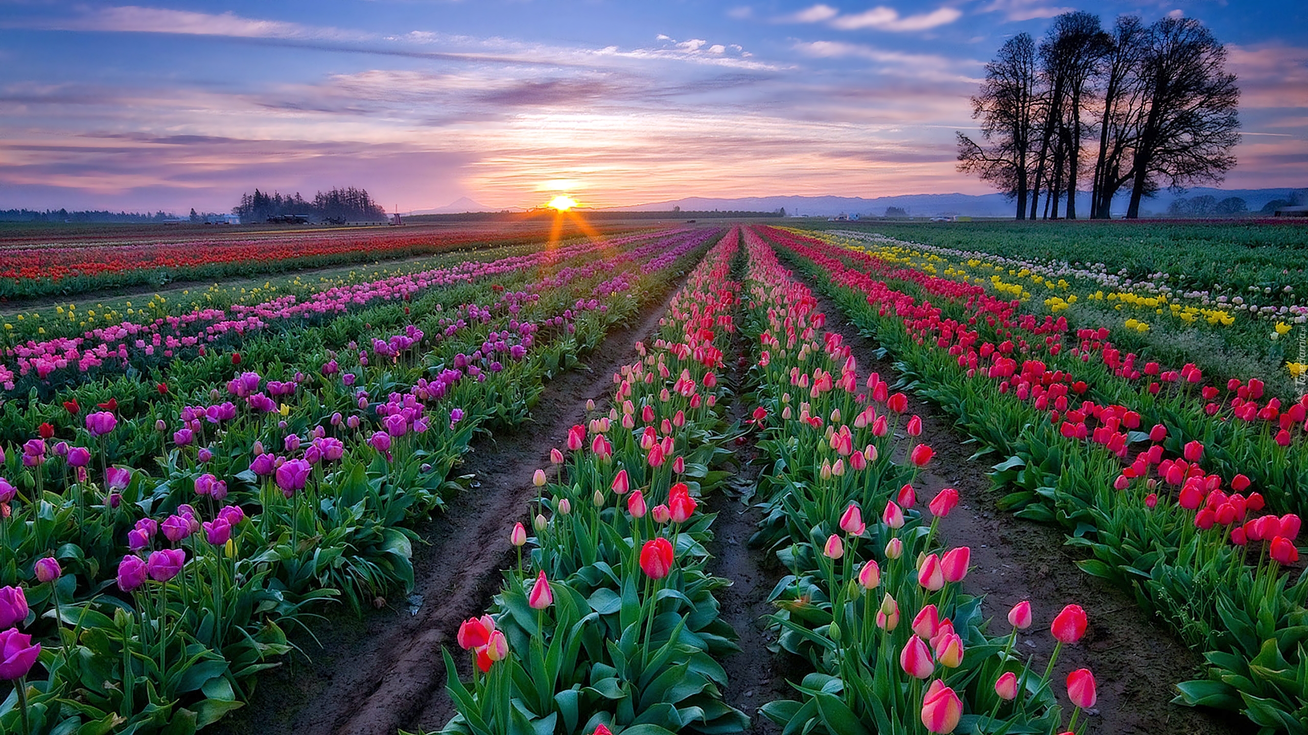 Edytor tapety: Tulipany, Pole, Zachód