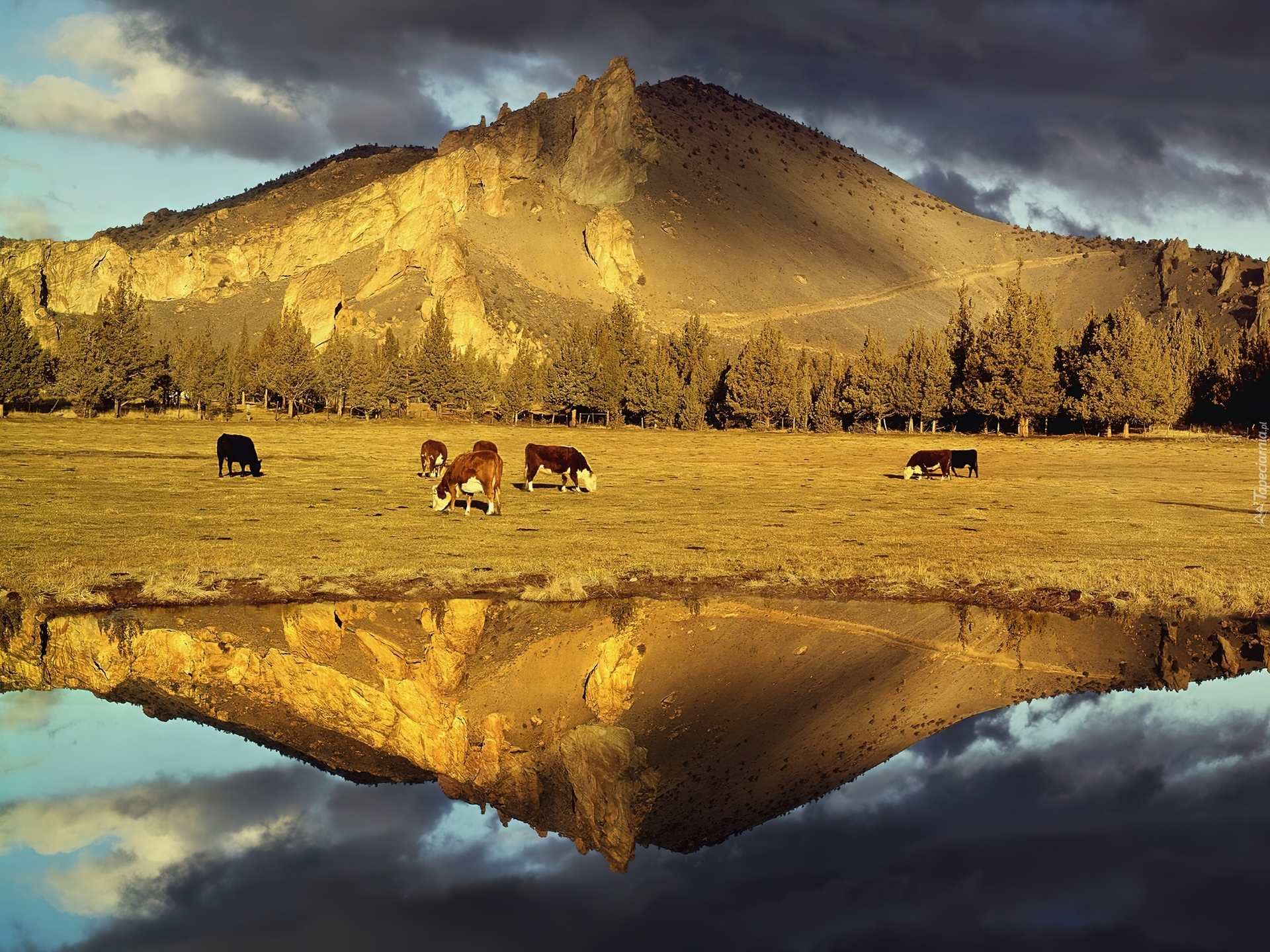 Edytor tapety: Góra, Pastwisko, Krowy, Woda, Odbicie
