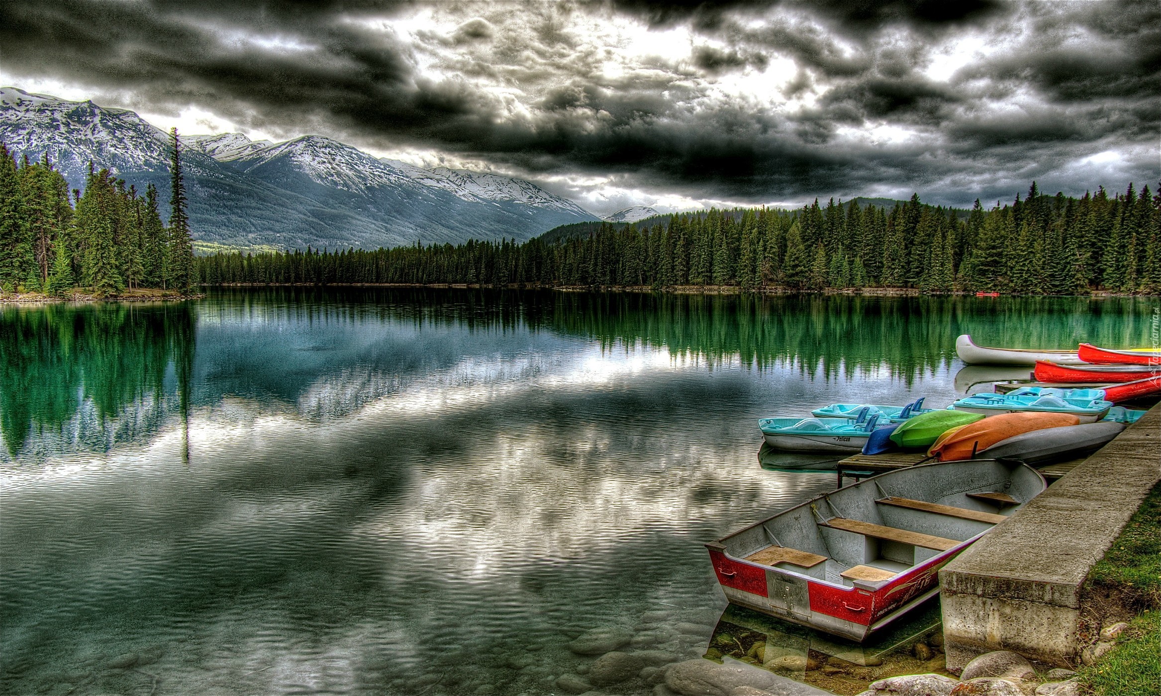 Edytor tapety: Góry, Jezioro, Łódki, Drzewa