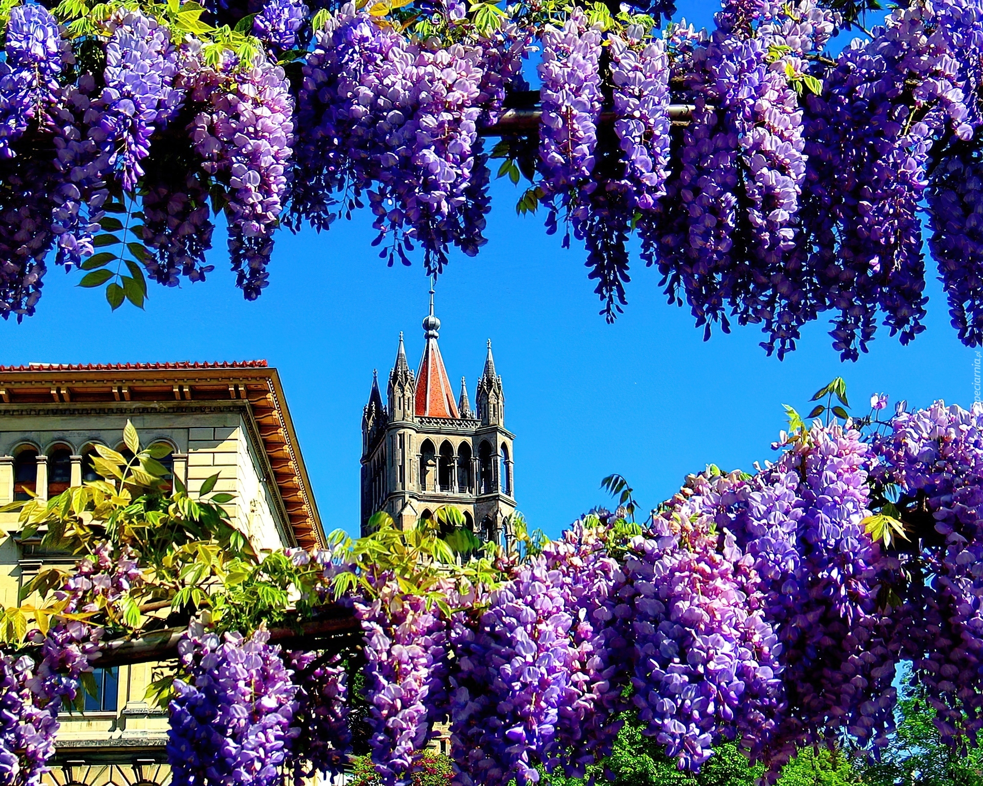 Edytor tapety: Kwiaty, Wisterii, Wieża