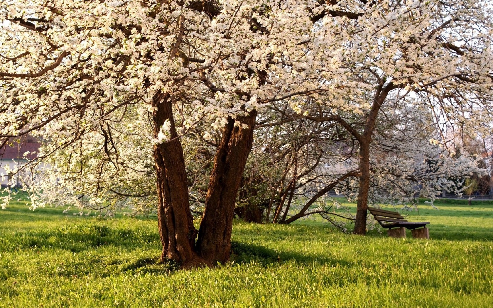Edytor tapety: Kwitnące, Drzewa, Trawa, Ławka