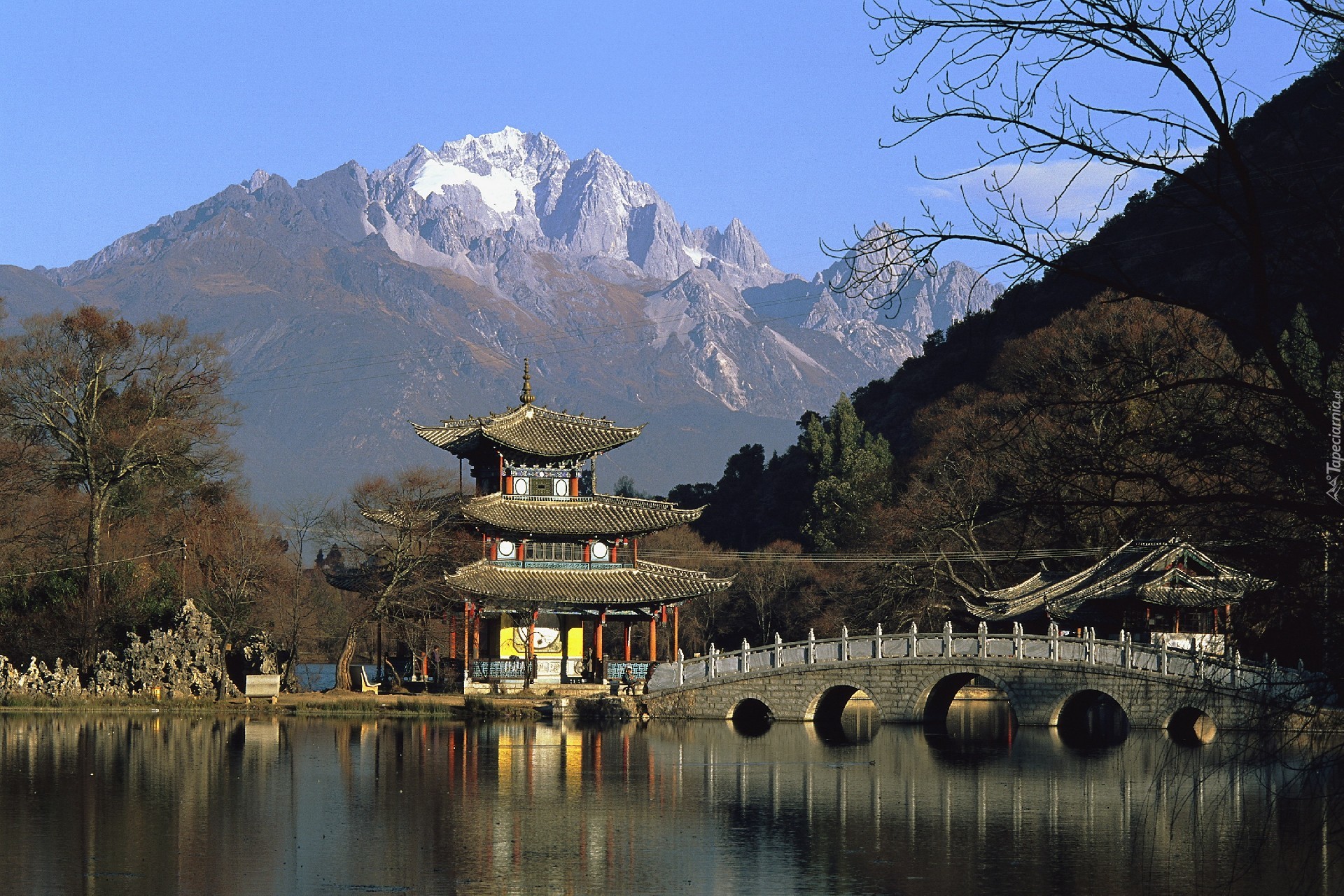 Edytor tapety: Japonia, Góry, Domek, Rzeka, Most