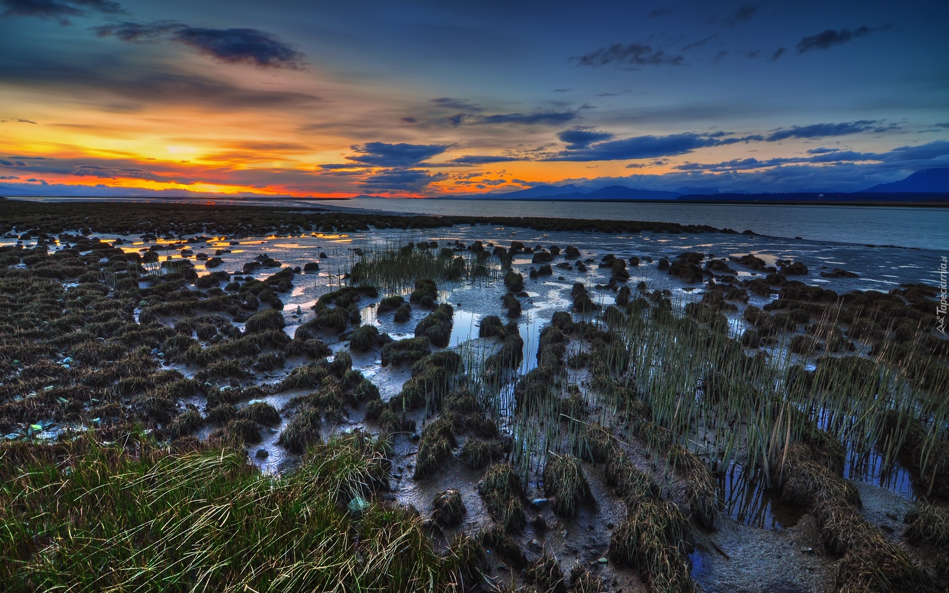 Edytor tapety: Rozlewisko, Rzeczne, Niebo, Zachodzące, Słońce