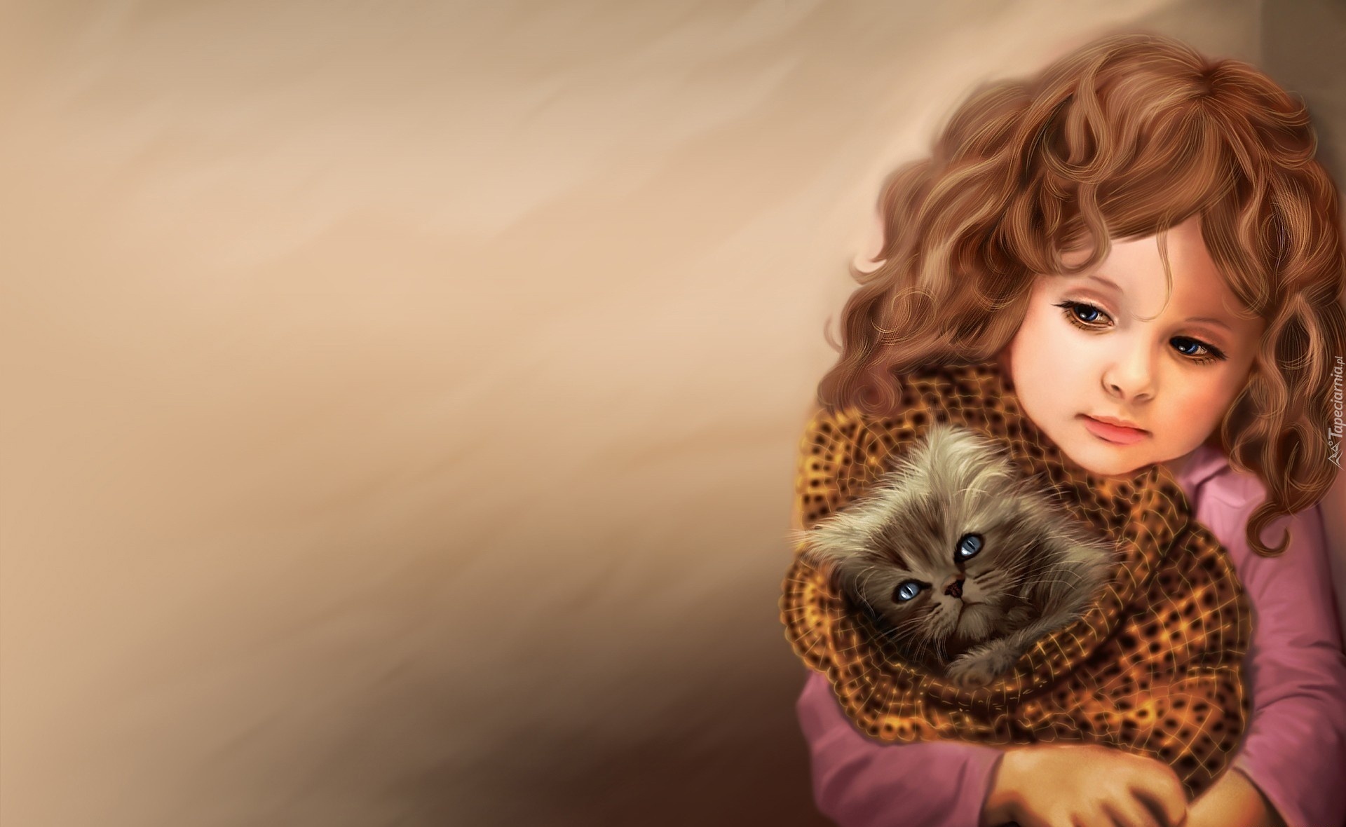 Edytor tapety: Dziewczynka, Długie, Włosy, Kotek