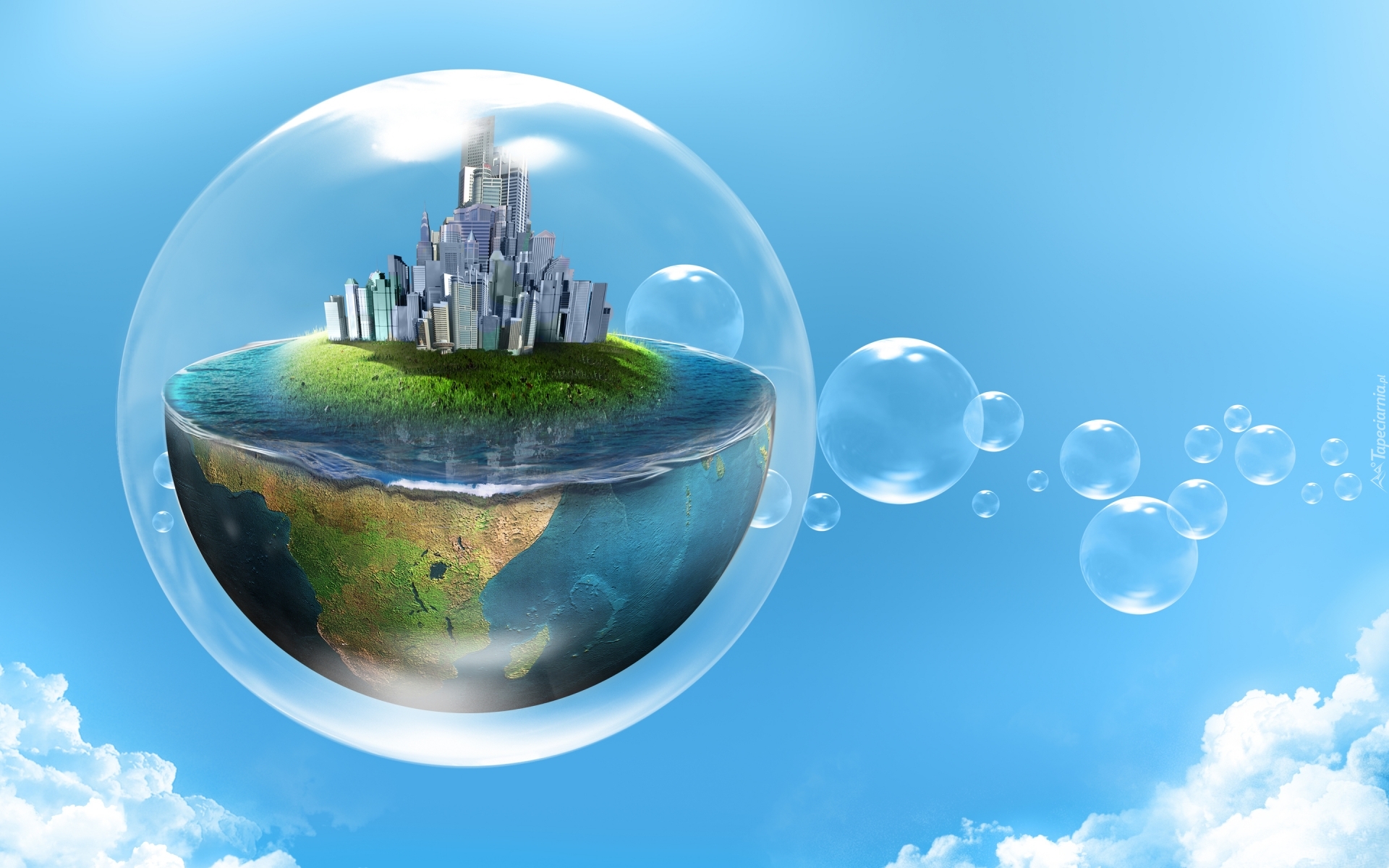 Edytor tapety: Abstrakcja, Bańki, Ziemia, Budynki, Chmury, Błękit