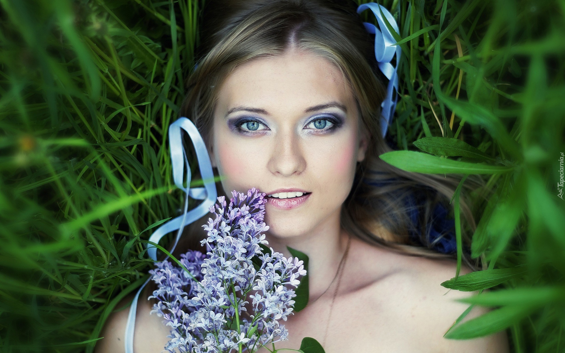 Edytor tapety: Kobieta, Kwiaty, Wstążka, Trawa