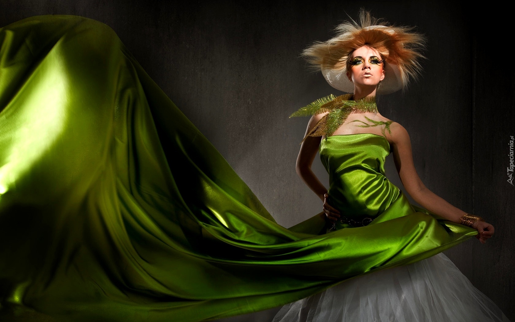 Edytor tapety: Kobieta, Zielona, Suknia, Fryzura