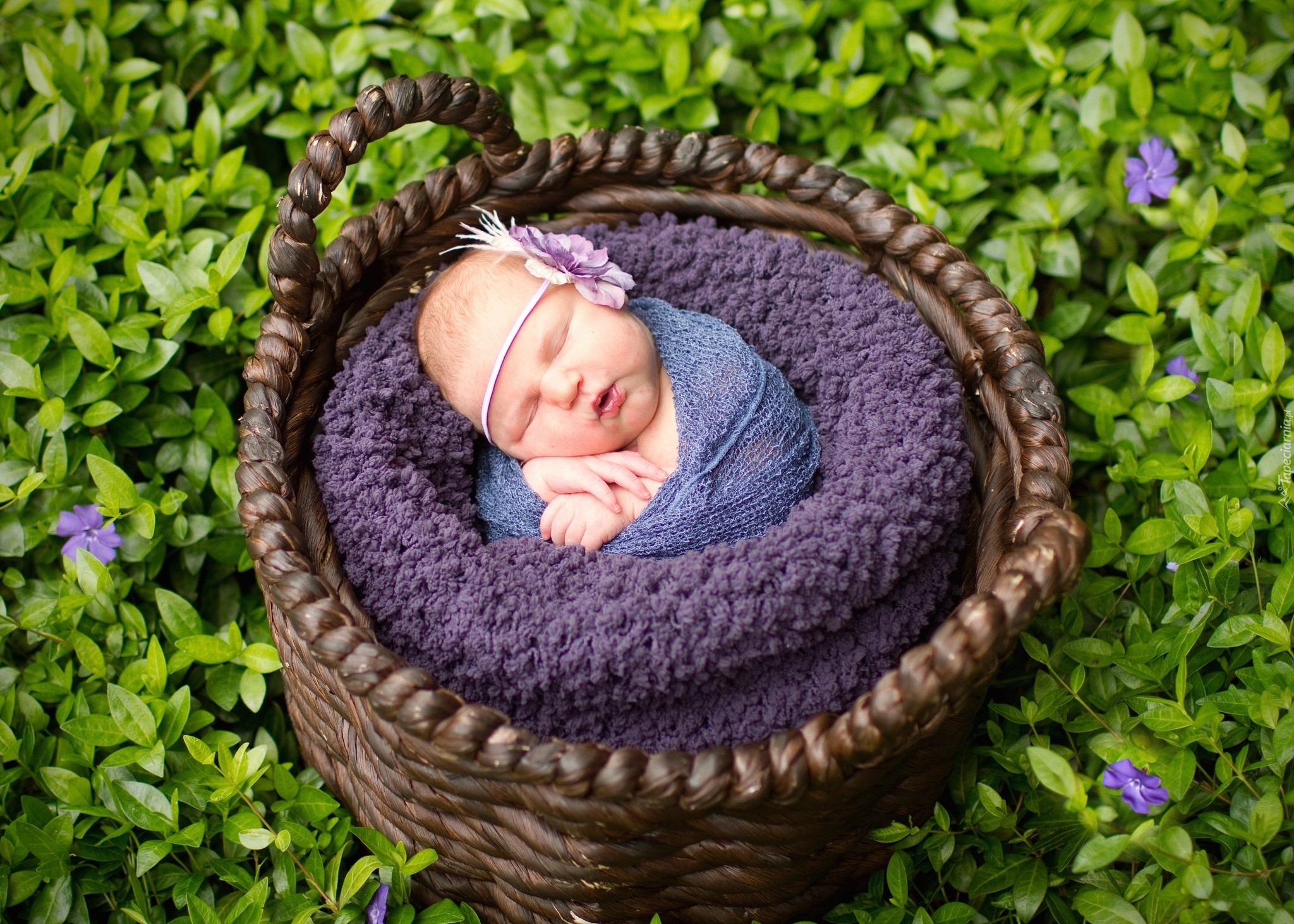 Edytor tapety: Śpiąca, Dziewczynka, Kosz, Kwiaty
