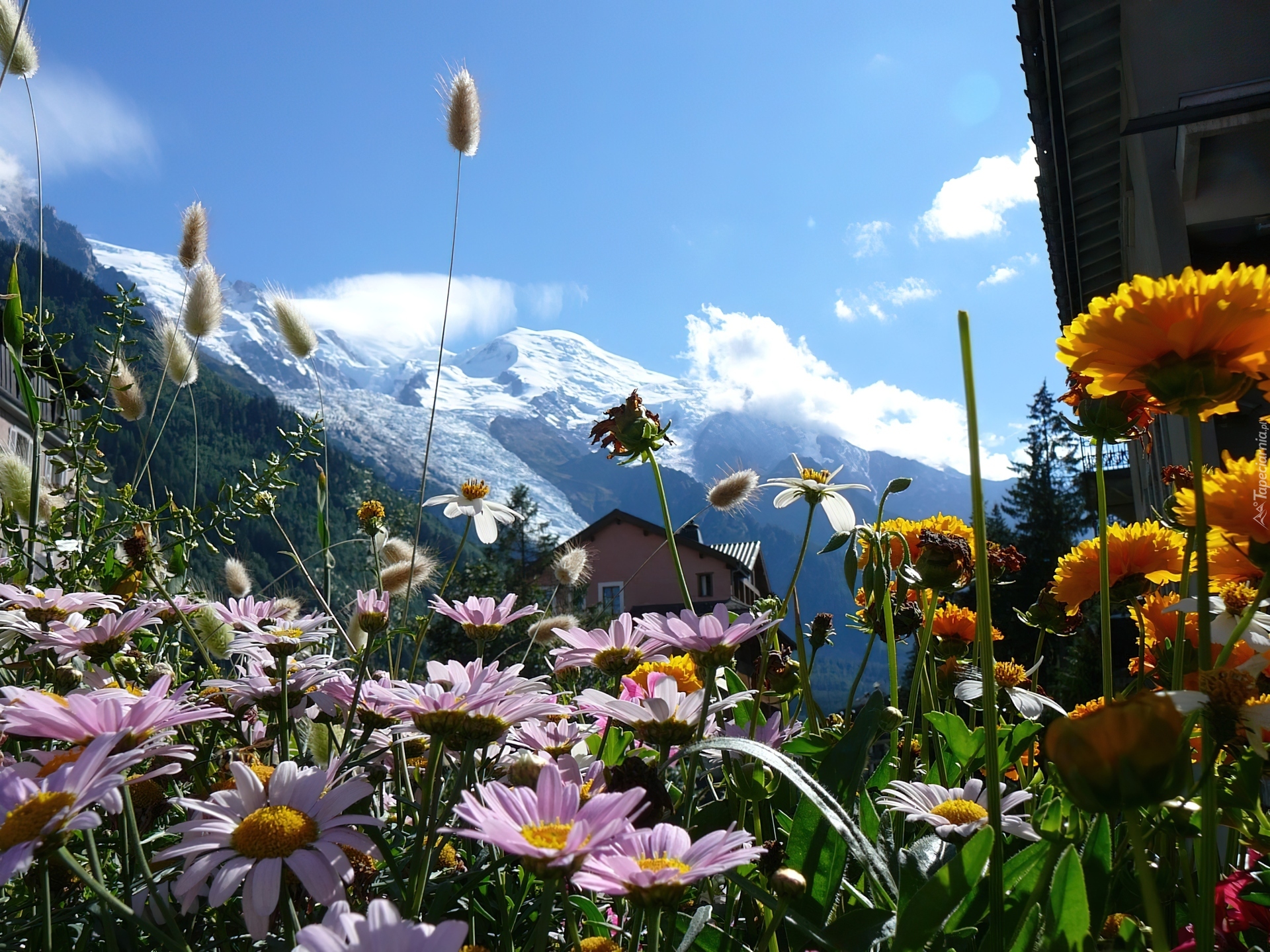 Edytor tapety: Góry, Dom, Kwiaty