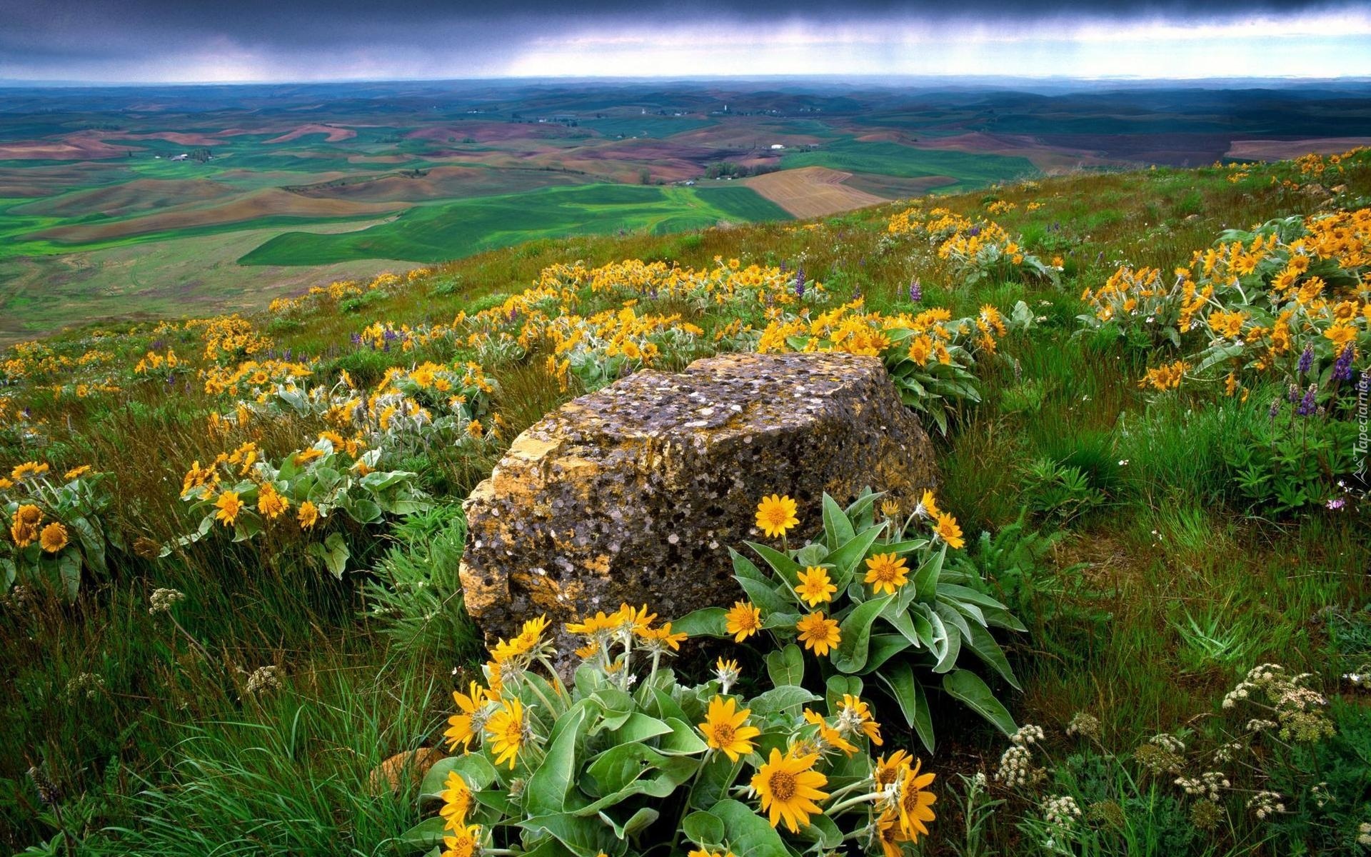 Edytor tapety: Łąka, Kwiaty, Kamień
