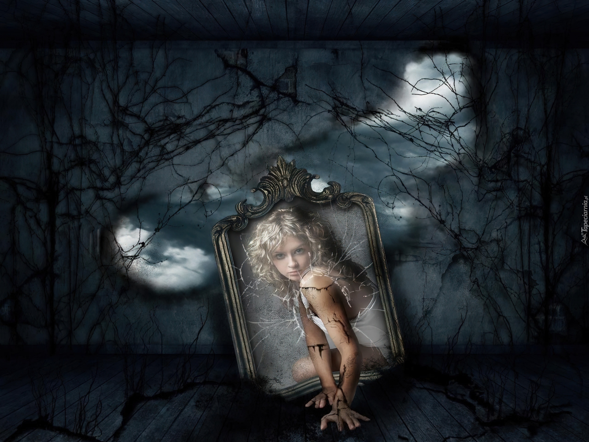 Edytor tapety: Dziewczyna, Lustro, Drzewa