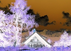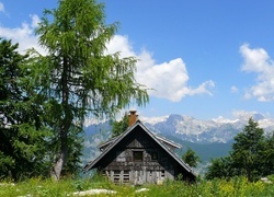 Edytor tapety: Chałupa, Drzewa, Góry