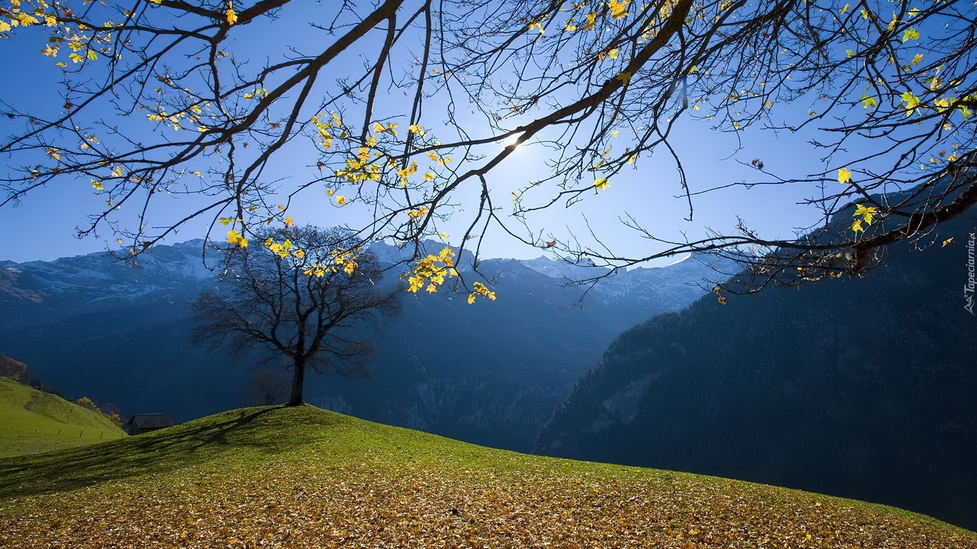 Edytor tapety: Góry, Gałęzie, Pagórek, Drzewo, Jesień