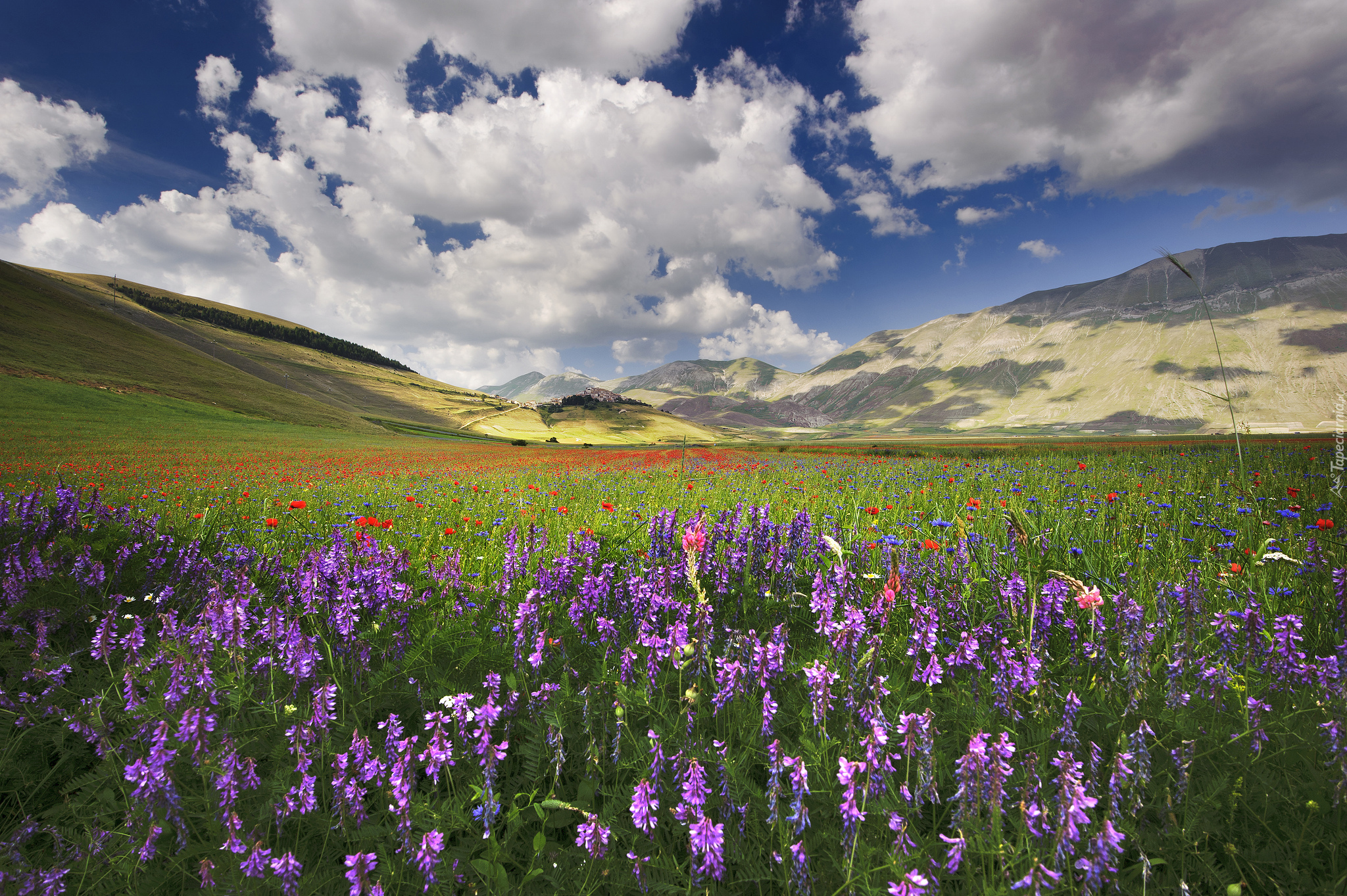 Edytor tapety: Góry, Białe, Chmury, Kwiaty