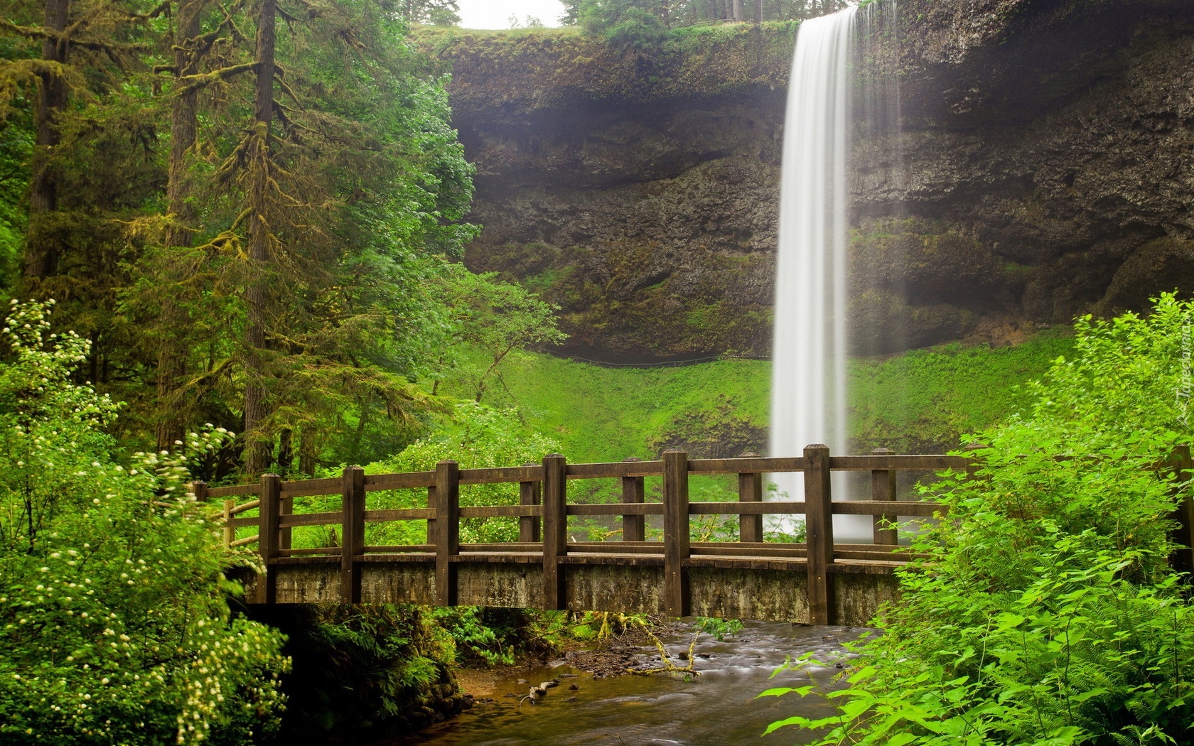 Edytor tapety: Wodospad, Mostek, Drzewa, Rzeczka