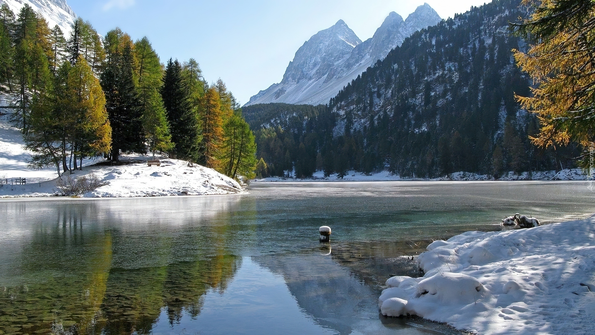 Edytor tapety: Góry, Jezioro, Drzewa, Śnieg