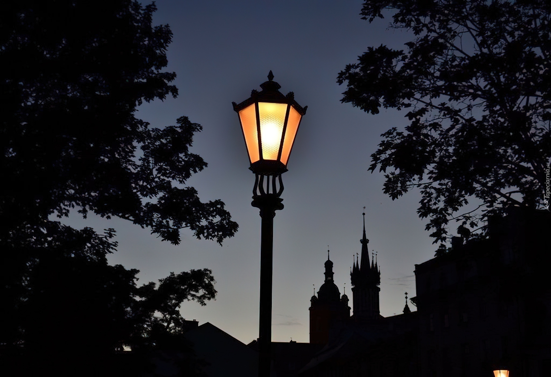 Edytor tapety: Miasto, Noc, Latarnia, Drzewa
