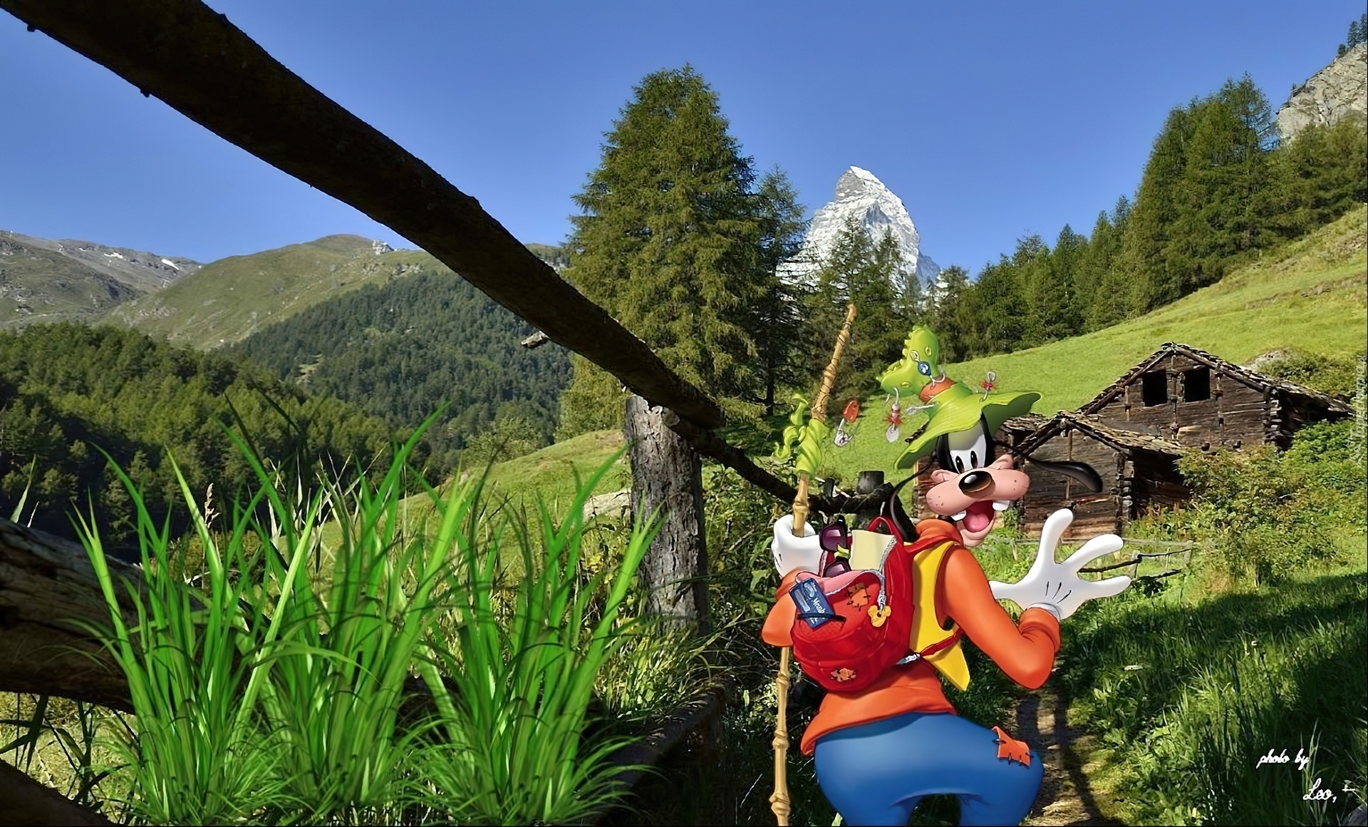 Edytor tapety: Góry, Łąka, Chata, Goofy