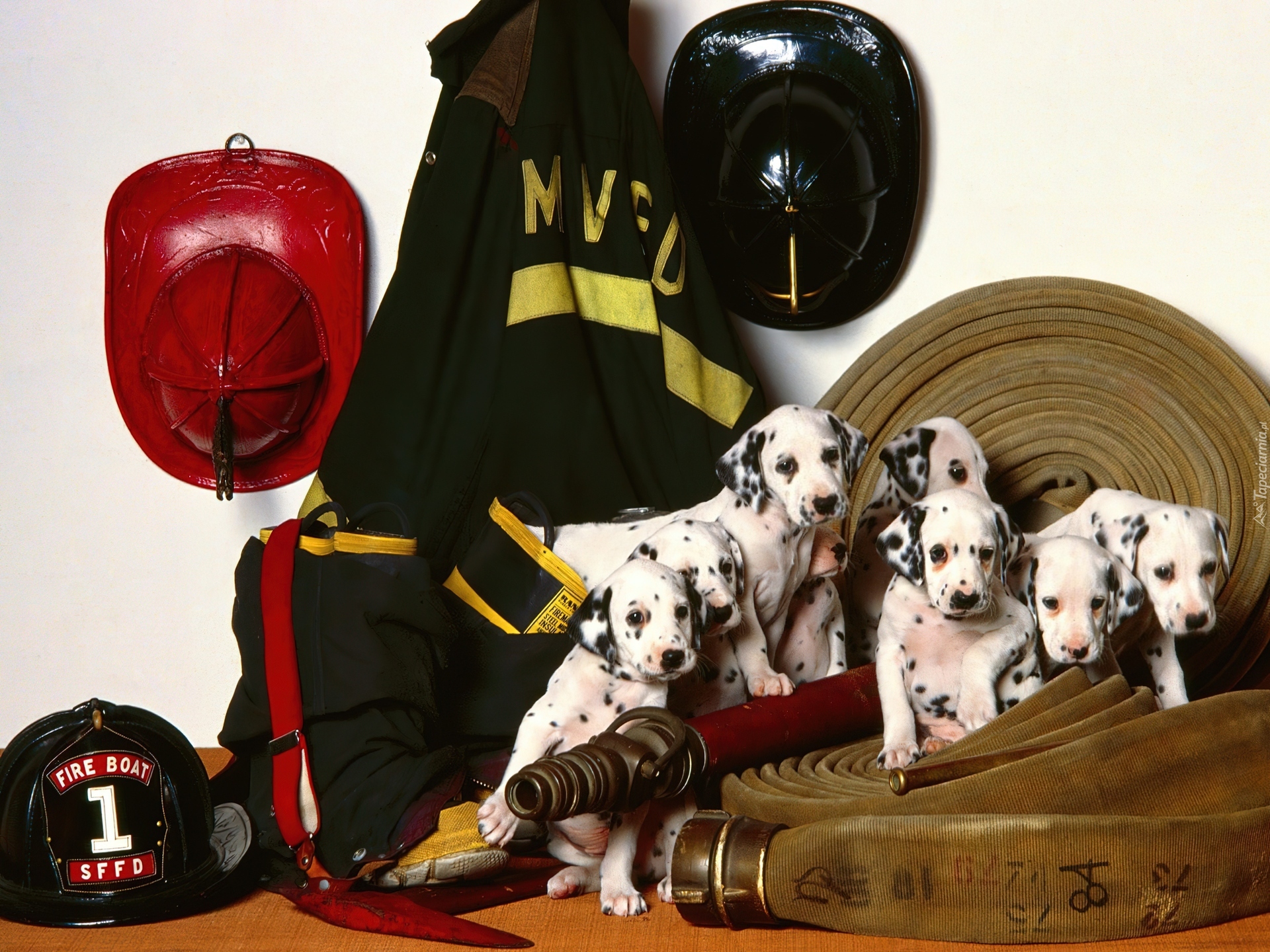 Edytor tapety: Szczeniaki, Delmatyńczyki, Sprzęt, Strażacki