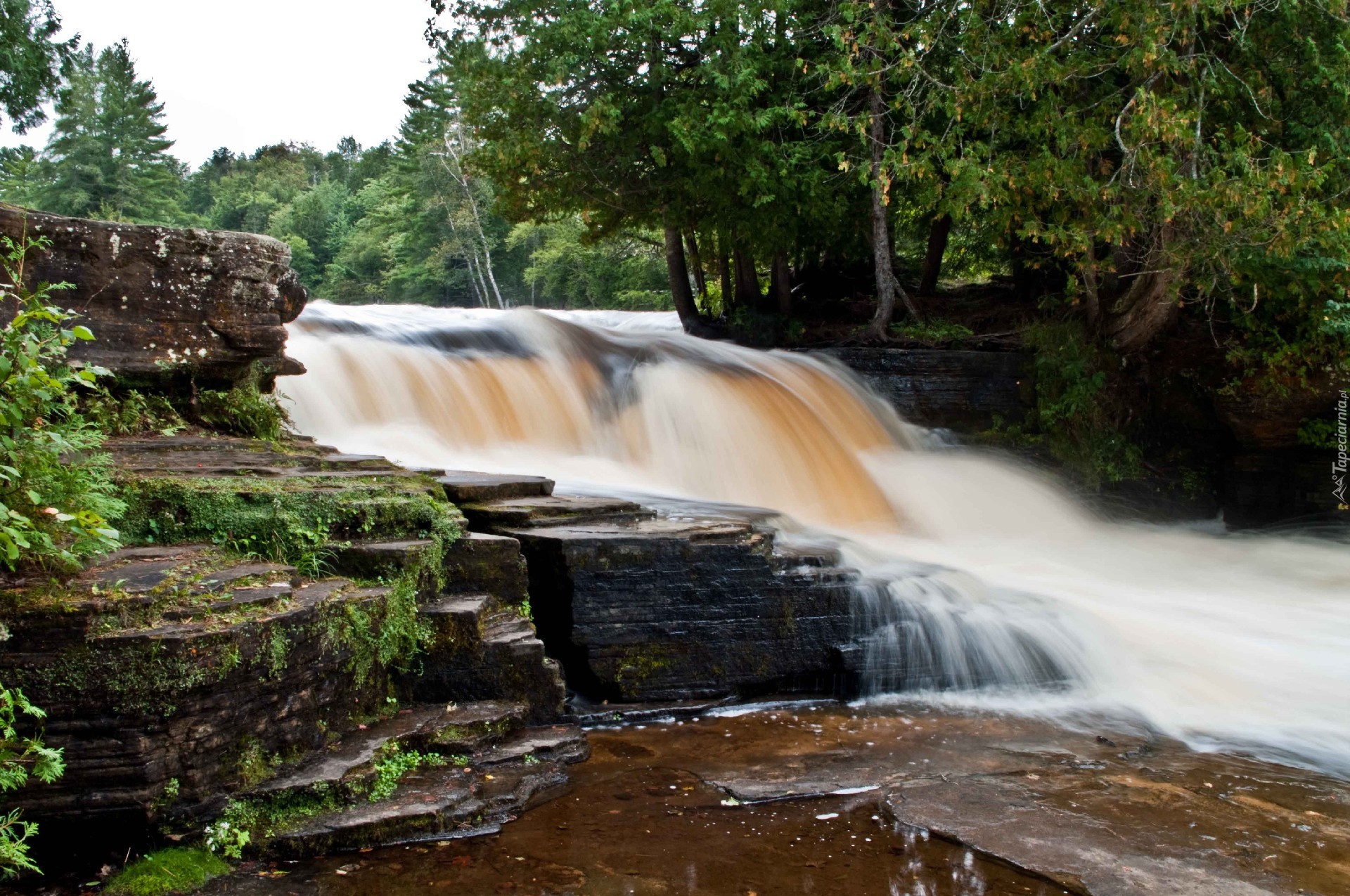Edytor tapety: Wodospad, Skałki, Las
